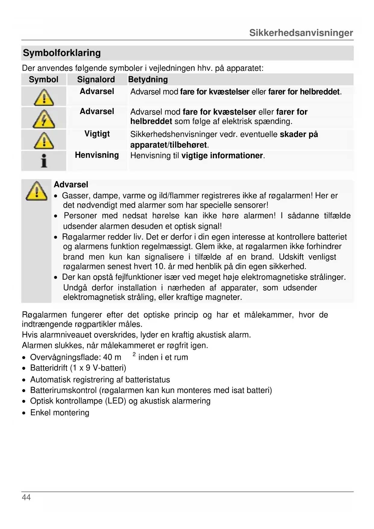 Advarsel Gasser, dampe, varme og ild/flammer registreres ikke af røgalarmen! Her er det nødvendigt med alarmer som har specielle sensorer! Personer med nedsat hørelse kan ikke høre alarmen! I sådanne tilfælde udsender alarmen desuden et optisk signal! Røgalarmer redder liv. Det er derfor i din egen interesse at kontrollere batteriet og alarmens funktion regelmæssigt. Glem ikke, at røgalarmen ikke forhindrer brand men kun kan signalisere i tilfælde af en brand. Udskift venligst røgalarmen senest hvert 10. år med henblik på din egen sikkerhed. Der kan opstå fejlfunktioner især ved meget høje elektromagnetiske strålinger. Undgå derfor installation i nærheden af apparater, som udsender elektromagnetisk stråling, eller kraftige magneter. Røgalarmen fungerer efter det optiske princip og har et målekammer, hvor de indtrængende røgpartikler måles. Hvis alarmniveauet overskrides, lyder en kraftig akustisk alarm. Alarmen slukkes, når målekammeret er røgfrit igen. Overvågningsflade: 40 m