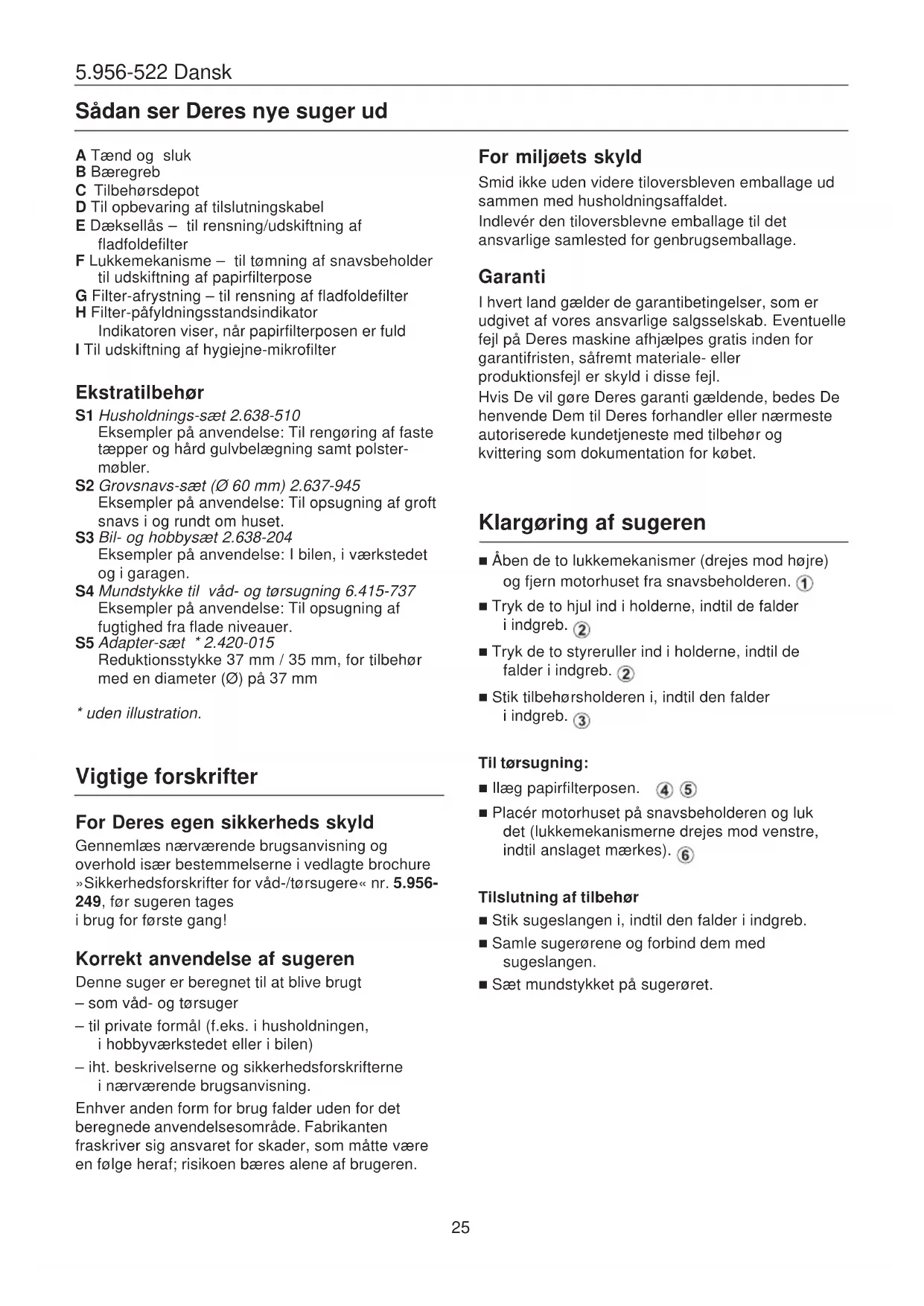 Gennemlæs nærværende brugsanvisning og overhold især bestemmelserne i vedlagte brochure »Sikkerhedsforskrifter for våd-/tørsugere« nr. 5.956-