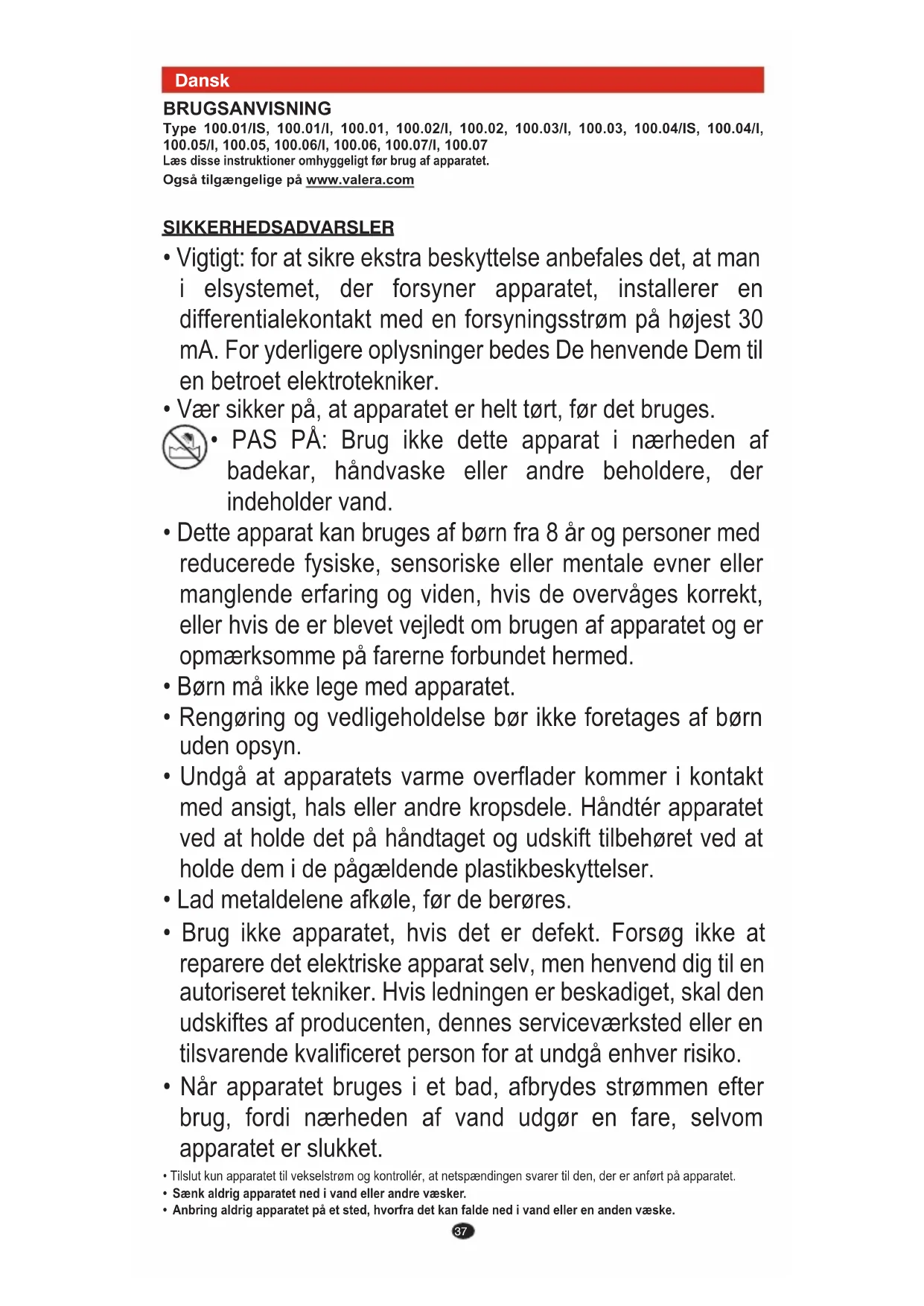 GARANTI VALERA garanterer apparatet, som De har købt, på