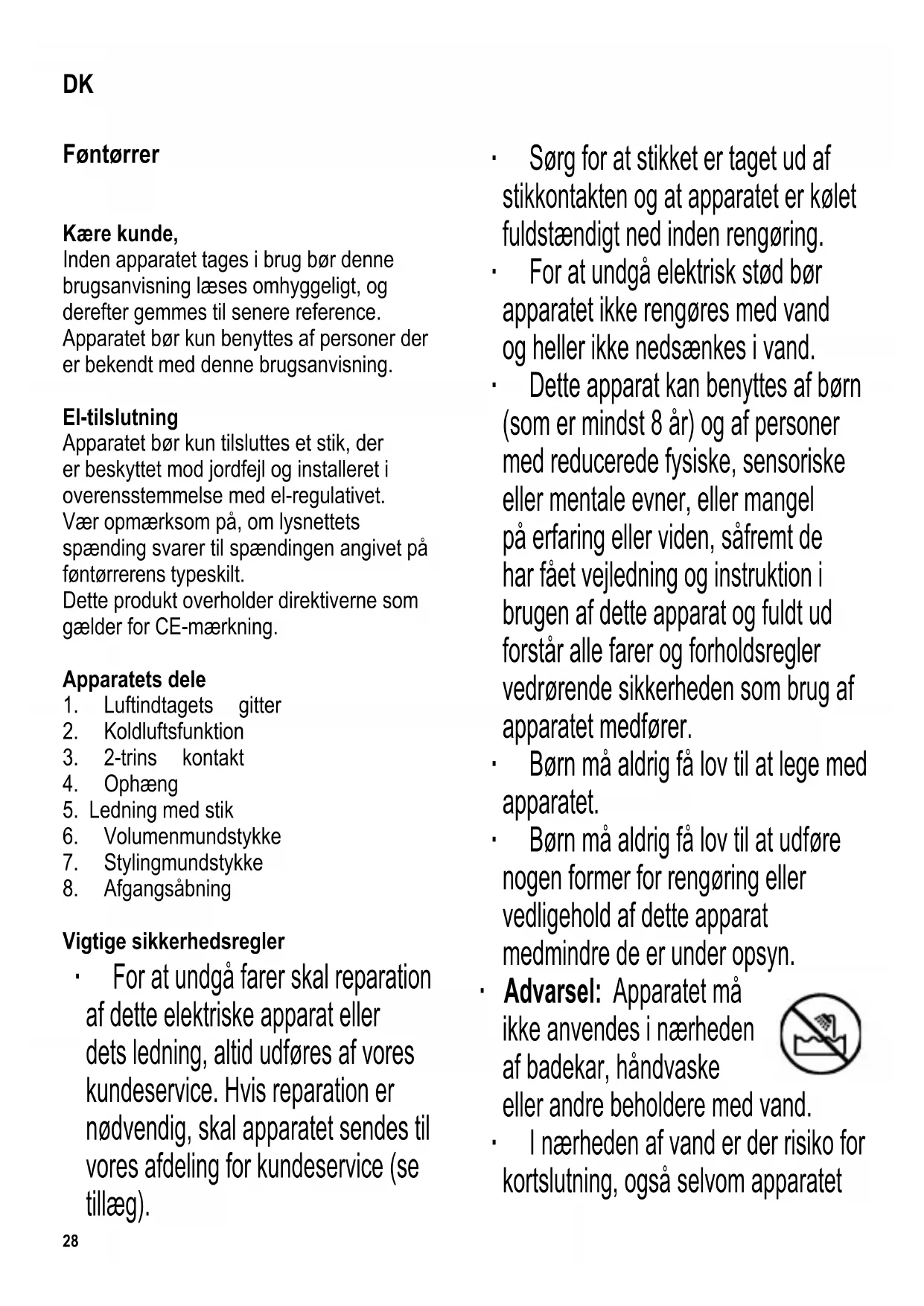 føntørreren ikke rengøres med vand, og