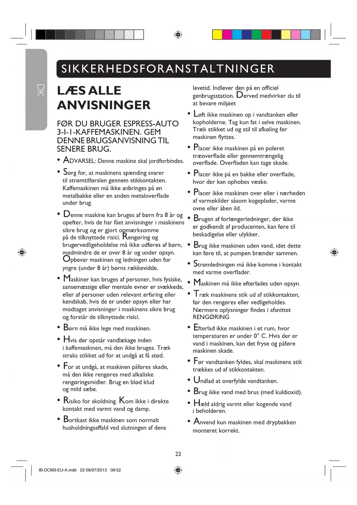 hen til symbolet med den lukkede lås. FORVARM FILTERHOLDER Kør en kop vand gennem maskinen ved at trykke på kop-knappen. Kontroller, at der IKKE er kaffe i lterholderen. VARM KOP Hvis din kaffe skal være ekstra varm, skal koppen med kaffe være opvarmet før HVER kaffebrygning. Kør en kop vand igennem, og smid vandet ud. Din maskine er nu klar til brug. 1.D 1.E 1.F IB-DCM3-EU-A.indd 24 08/07/2013 09:5225