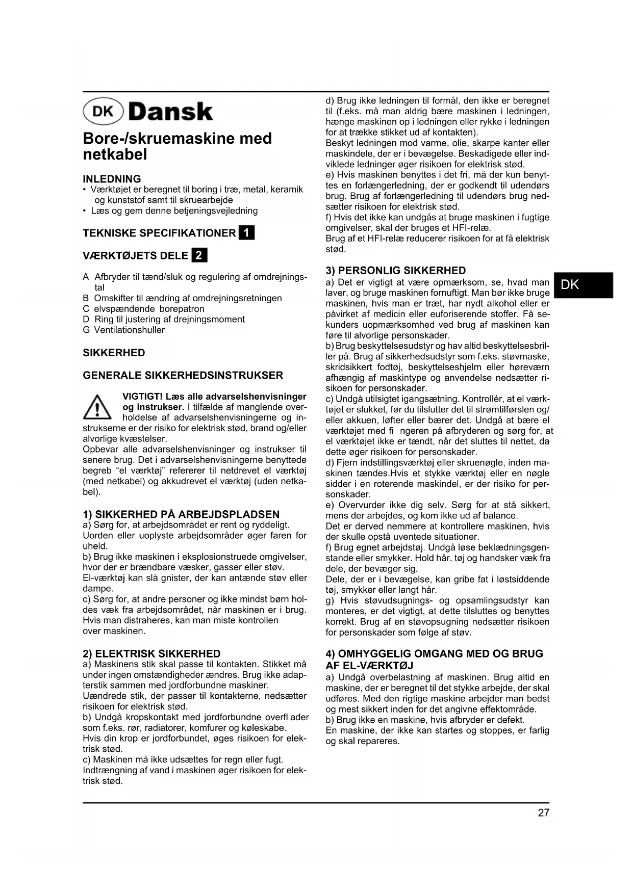 A Afbryder til tænd/sluk og regulering af omdrejnings- tal B Omskifter til ændring af omdrejningsretningen C elvspændende borepatron D Ring til justering af drejningsmoment G Ventilationshuller SIKKERHED GENERALE SIKKERHEDSINSTRUKSER VIGTIGT! Læs alle advarselshenvisninger og instrukser. I tilfælde af manglende over- holdelse af advarselshenvisningerne og in- strukserne er der risiko for elektrisk stød, brand og/eller alvorlige kvæstelser. Opbevar alle advarselshenvisninger og instrukser til senere brug. Det i advarselshenvisningerne benyttede begreb “el værktøj” refererer til netdrevet el værktøj (med netkabel) og akkudrevet el værktøj (uden netka- bel).
