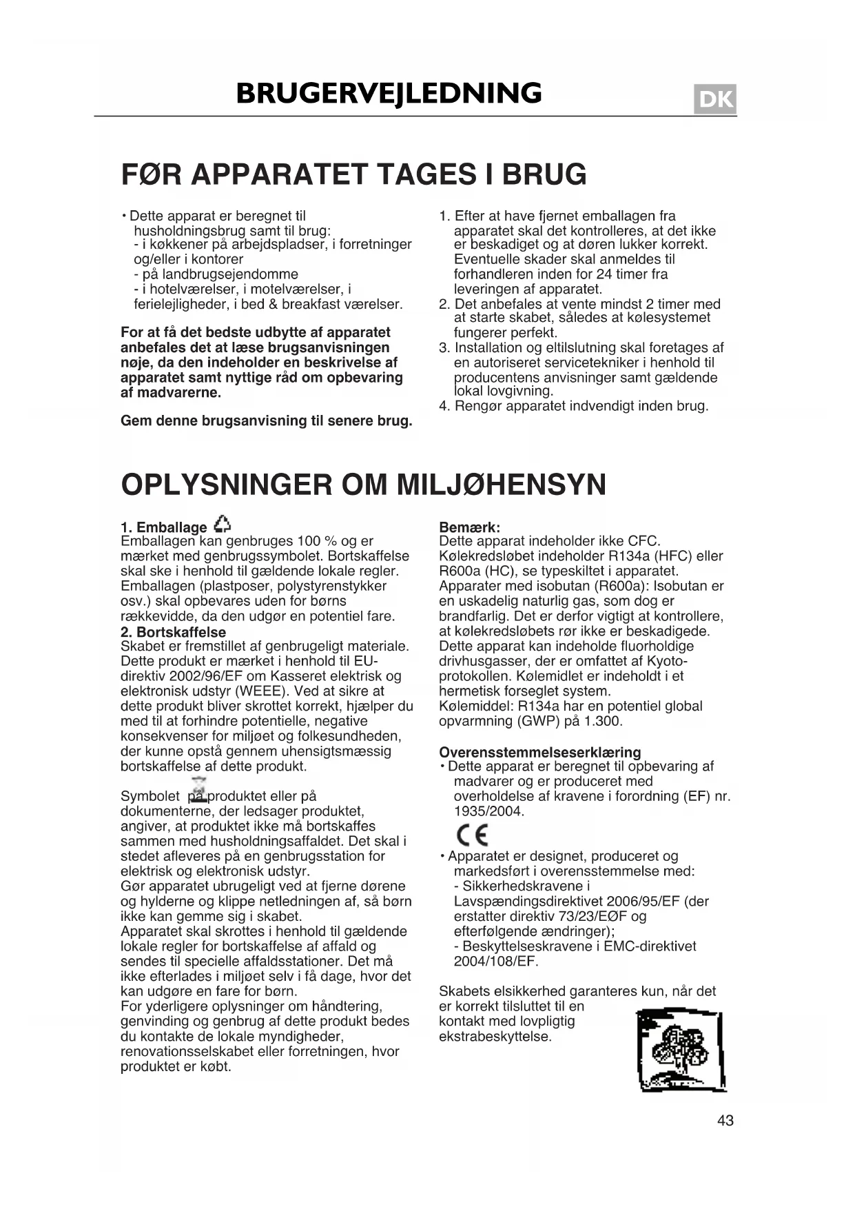 FØR APPARATET TAGES I BRUG • Dette apparat er beregnet tilhusholdningsbrug samt til brug:- i køkkener på arbejdspladser, i forretningerog/eller i kontorer- på landbrugsejendomme- i hotelværelser, i motelværelser, iferielejligheder, i bed & breakfast værelser.For at få det bedste udbytte af apparatetanbefales det at læse brugsanvisningennøje, da den indeholder en beskrivelse afapparatet samt nyttige råd om opbevaringaf madvarerne.Gem denne brugsanvisning til senere brug.1. Efter at have fjernet emballagen fraapparatet skal det kontrolleres, at det ikkeer beskadiget og at døren lukker korrekt.Eventuelle skader skal anmeldes tilforhandleren inden for 24 timer fraleveringen af apparatet.2. Det anbefales at vente mindst 2 timer medat starte skabet, således at kølesystemetfungerer perfekt.3. Installation og eltilslutning skal foretages afen autoriseret servicetekniker i henhold tilproducentens anvisninger samt gældendelokal lovgivning.4. Rengør apparatet indvendigt inden brug.1. Emballage Emballagen kan genbruges 100 % og ermærket med genbrugssymbolet. Bortskaffelseskal ske i henhold til gældende lokale regler.Emballagen (plastposer, polystyrenstykkerosv.) skal opbevares uden for børnsrækkevidde, da den udgør en potentiel fare.2. BortskaffelseSkabet er fremstillet af genbrugeligt materiale.Dette produkt er mærket i henhold til EU-direktiv 2002/96/EF om Kasseret elektrisk ogelektronisk udstyr (WEEE). Ved at sikre atdette produkt bliver skrottet korrekt, hjælper dumed til at forhindre potentielle, negativekonsekvenser for miljøet og folkesundheden,der kunne opstå gennem uhensigtsmæssigbortskaffelse af dette produkt.Symbolet på produktet eller pådokumenterne, der ledsager produktet,angiver, at produktet ikke må bortskaffessammen med husholdningsaffaldet. Det skal istedet afleveres på en genbrugsstation forelektrisk og elektronisk udstyr.Gør apparatet ubrugeligt ved at fjerne døreneog hylderne og klippe netledningen af, så børnikke kan gemme sig i skabet.Apparatet skal skrottes i henhold til gældendelokale regler for bortskaffelse af affald ogsendes til specielle affaldsstationer. Det måikke efterlades i miljøet selv i få dage, hvor detkan udgøre en fare for børn.For yderligere oplysninger om håndtering,genvinding og genbrug af dette produkt bedesdu kontakte de lokale myndigheder,renovationsselskabet eller forretningen, hvorproduktet er købt.Bemærk:Dette apparat indeholder ikke CFC.Kølekredsløbet indeholder R134a (HFC) ellerR600a (HC), se typeskiltet i apparatet.Apparater med isobutan (R600a): Isobutan eren uskadelig naturlig gas, som dog erbrandfarlig. Det er derfor vigtigt at kontrollere,at kølekredsløbets rør ikke er beskadigede.Dette apparat kan indeholde fluorholdigedrivhusgasser, der er omfattet af Kyoto-protokollen. Kølemidlet er indeholdt i ethermetisk forseglet system.Kølemiddel: R134a har en potentiel globalopvarmning (GWP) på 1.300.Overensstemmelseserklæring• Dette apparat er beregnet til opbevaring afmadvarer og er produceret medoverholdelse af kravene i forordning (EF) nr.1935/2004.• Apparatet er designet, produceret ogmarkedsført i overensstemmelse med:- Sikkerhedskravene iLavspændingsdirektivet 2006/95/EF (dererstatter direktiv 73/23/EØF ogefterfølgende ændringer);- Beskyttelseskravene i EMC-direktivet2004/108/EF.Skabets elsikkerhed garanteres kun, når deter korrekt tilsluttet til enkontakt med lovpligtigekstrabeskyttelse. OPLYSNINGER OM MILJØHENSYN Standard_pages_DK_m:Layout 1 6/2/09 8:33 AM Page 1