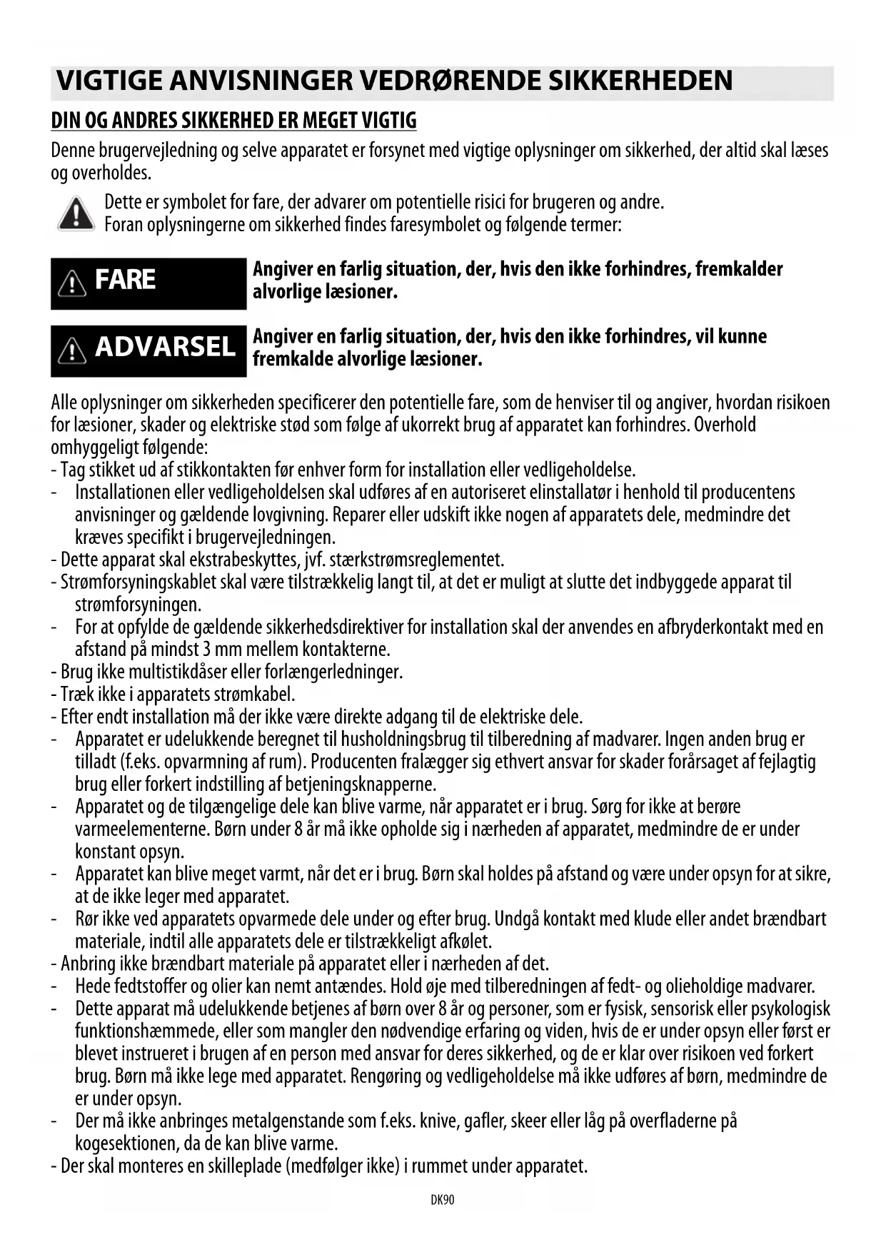 VIGTIGE ANVISNINGER VEDRØRENDE SIKKERHEDEN Dette er symbolet for fare, der advarer om potentielle risici for brugeren og andre.