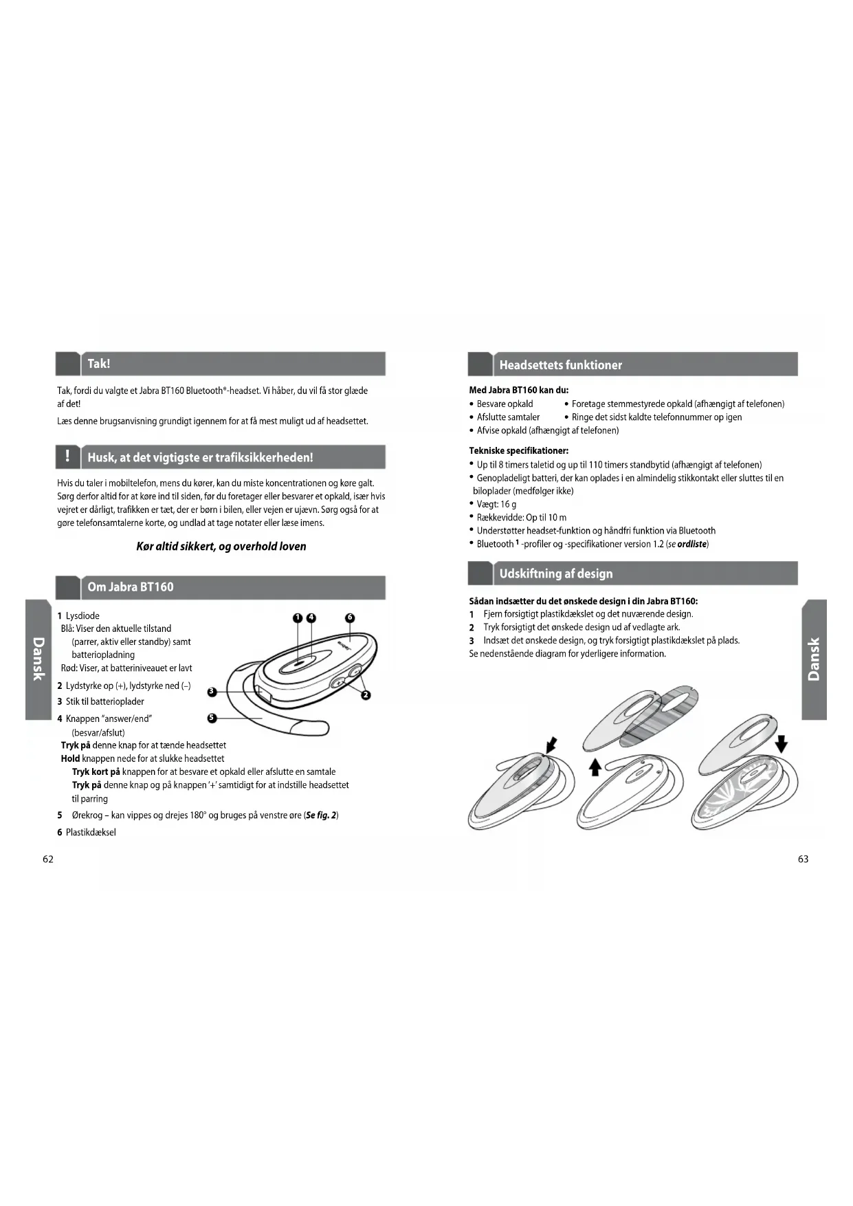 Tak, fordi du valgte et Jabra BT160 Bluetooth®-headset. Vi håber, du vil få stor glæde af det! Læs denne brugsanvisning grundigt igennem for at få mest muligt ud af headsettet. Tak! Hvis du taler i mobiltelefon, mens du kører, kan du miste koncentrationen og køre galt. Sørg derfor altid for at køre ind til siden, før du foretager eller besvarer et opkald, især hvis vejret er dårligt, trafikken er tæt, der er børn i bilen, eller vejen er ujævn. Sørg også for at gøre telefonsamtalerne korte, og undlad at tage notater eller læse imens. Kør altid sikkert, og overhold loven