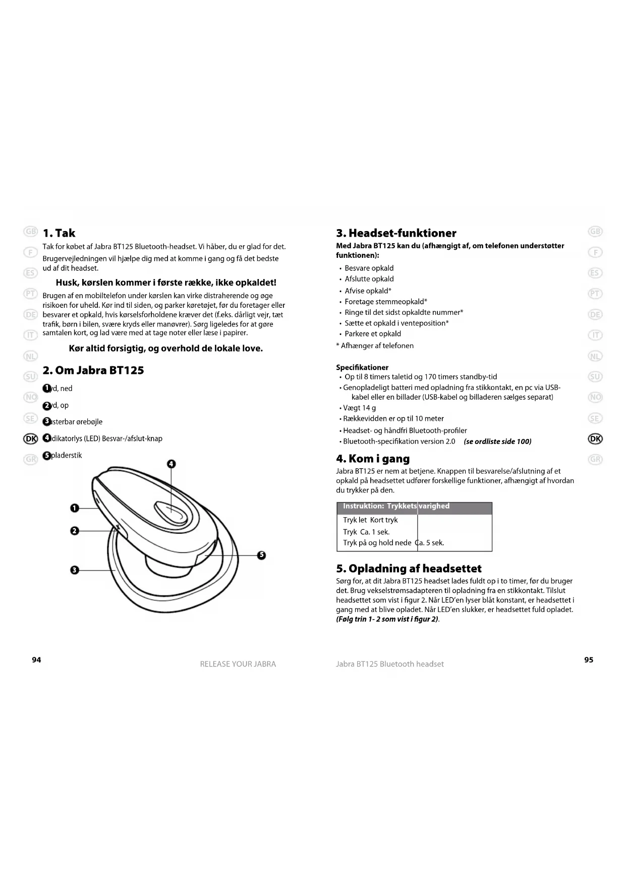 GB F ES PT DE IT NL SU NO SE DK GR Jabra BT125 Bluetooth headset