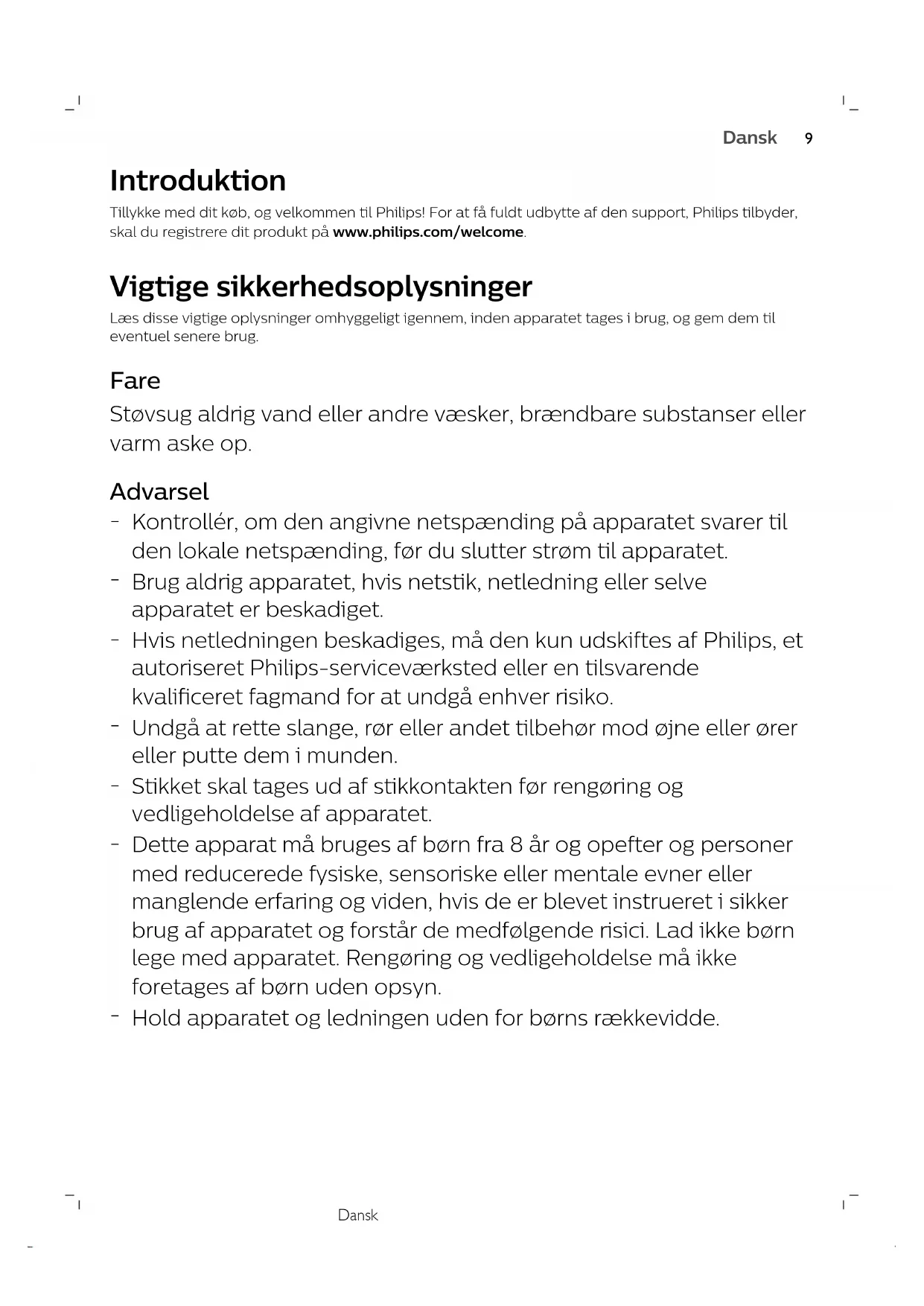 Introduktion Tillykke med dit køb, og velkommen til Philips! For at få fuldt udbytte af den support, Philips tilbyder,skal du registrere dit produkt på www.philips.com/welcome. Vigtige sikkerhedsoplysninger Læs disse vigtige oplysninger omhyggeligt igennem, inden apparatet tages i brug, og gem dem tileventuel senere brug. Fare