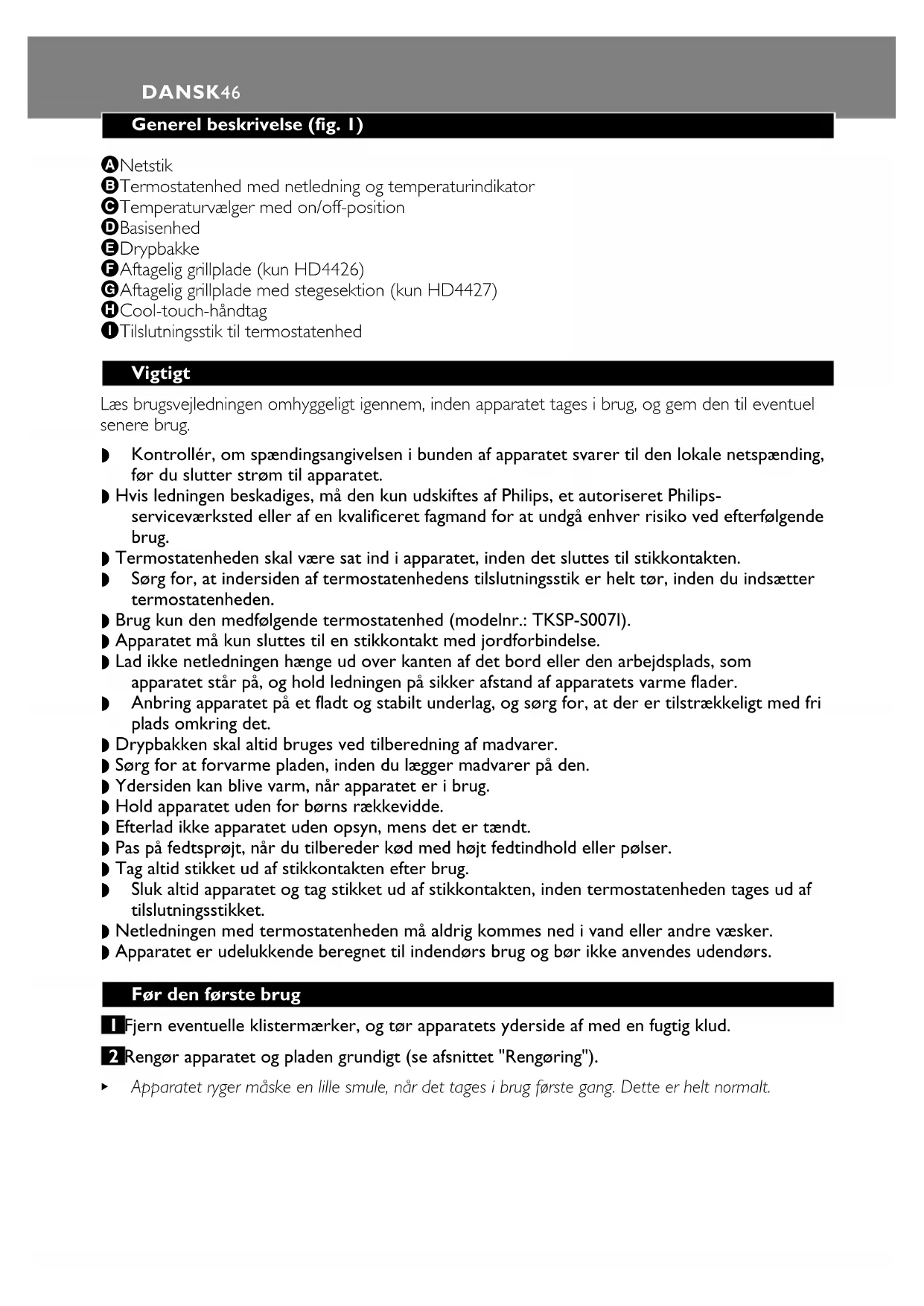 B Apparatet ryger måske en lille smule, når det tages i brug første gang. Dette er helt normalt.