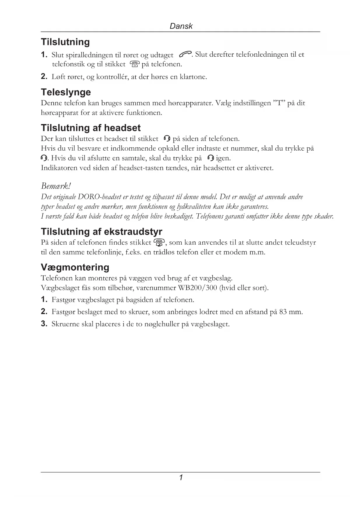 igen. Indikatoren ved siden af headset-tasten tændes, når headsettet er aktiveret. Bemærk! Det originale DORO-headset er testet og tilpasset til denne model. Det er muligt at anvende andre typer headset og andre mærker, men funktionen og lydkvaliteten kan ikke garanteres. I værste fald kan både headset og telefon blive beskadiget. Telefonens garanti omfatter ikke denne type skader. Tilslutning af ekstraudstyr På siden af telefonen ndes stikket 8, som kan anvendes til at slutte andet teleudstyr til den samme telefonlinje, f.eks. en trådløs telefon eller et modem m.m. Vægmontering Telefonen kan monteres på væggen ved brug af et vægbeslag. Vægbeslaget fås som tilbehør, varenummer WB200/300 (hvid eller sort).