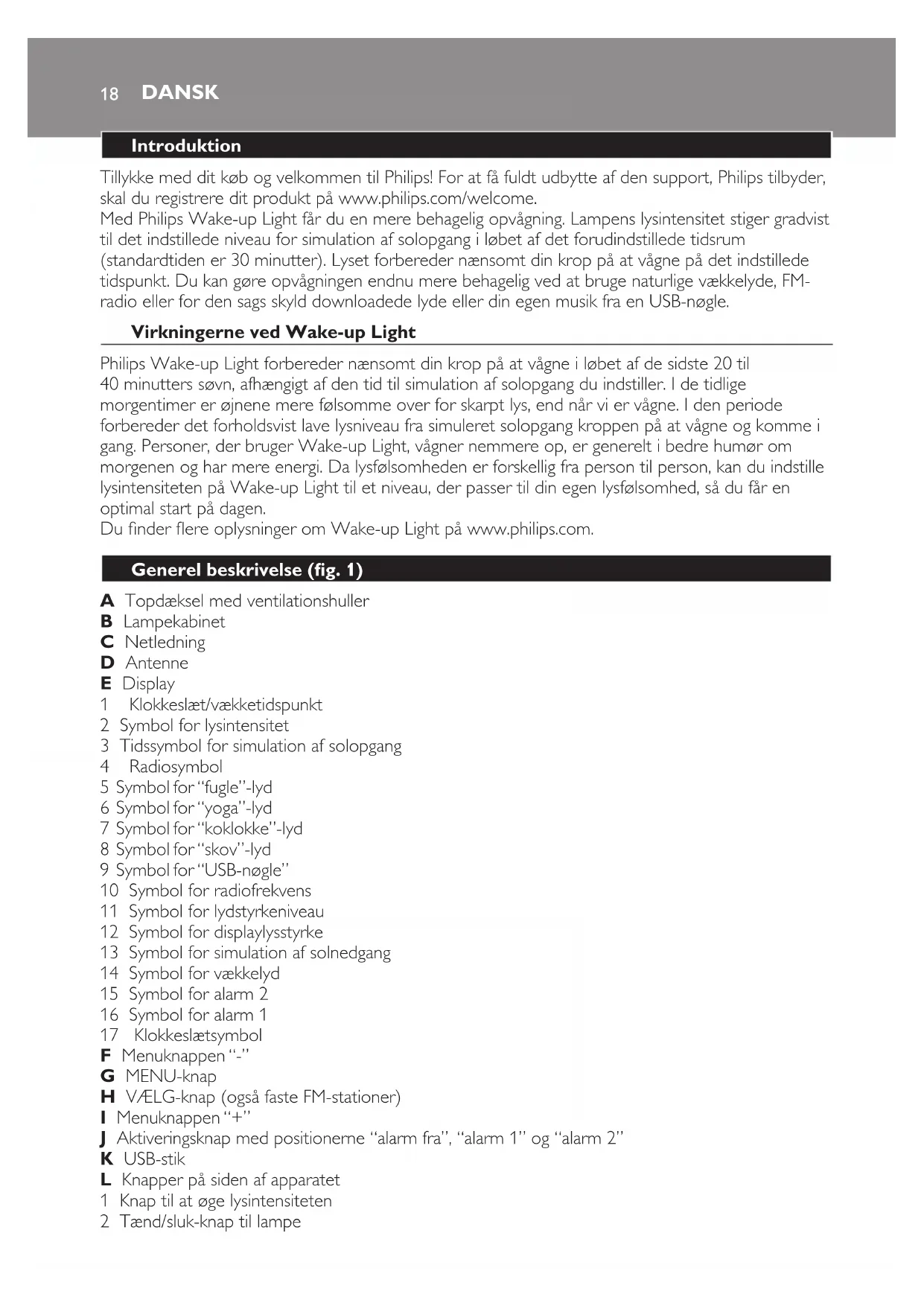 DANSK 19- Hvis du ofte vågner for tidligt eller med hovedpine, skal du reducere lysintensitetsniveauet og/