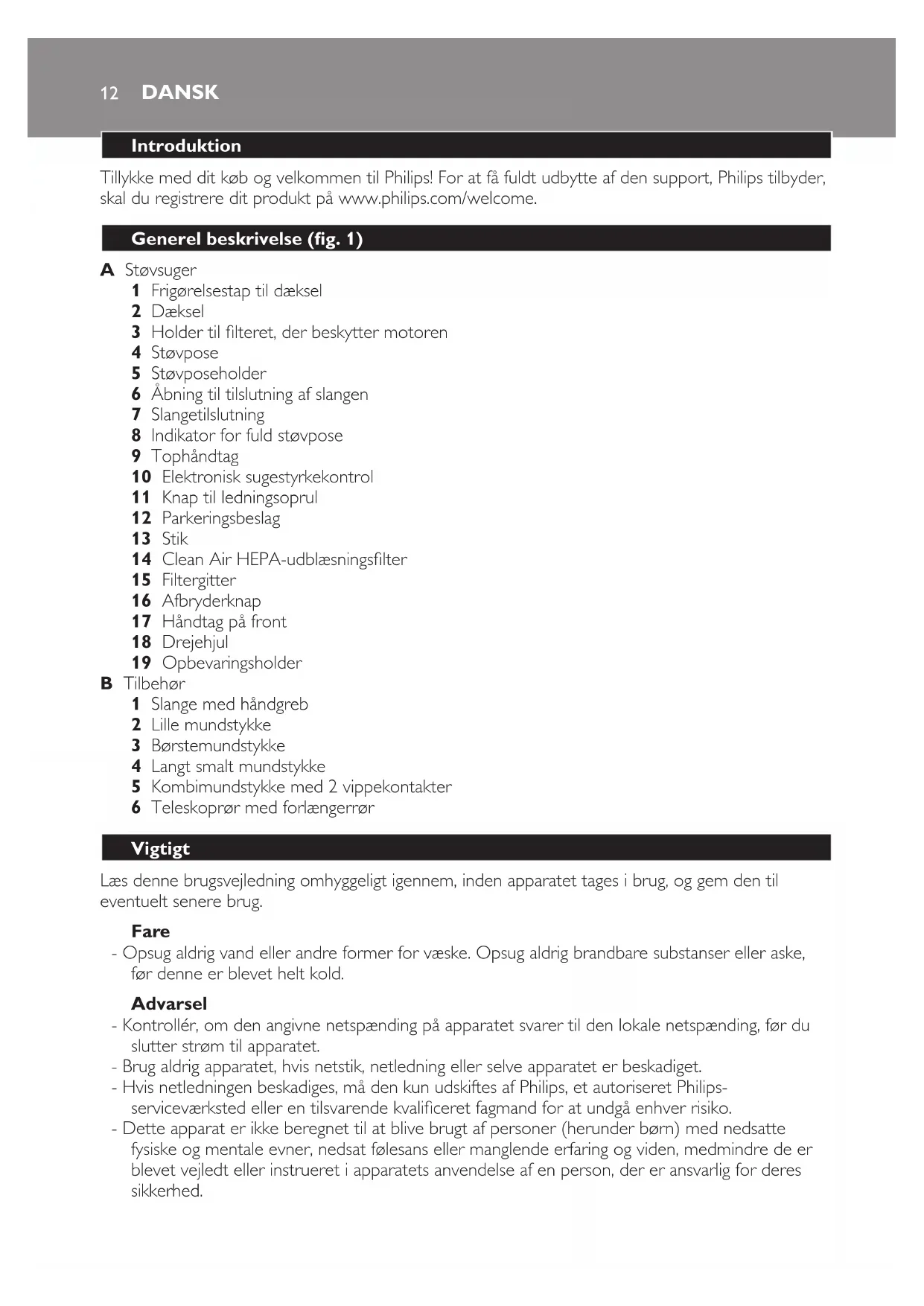 - Hvis netledningen beskadiges, må den kun udskiftes af Philips, et autoriseret Philips-