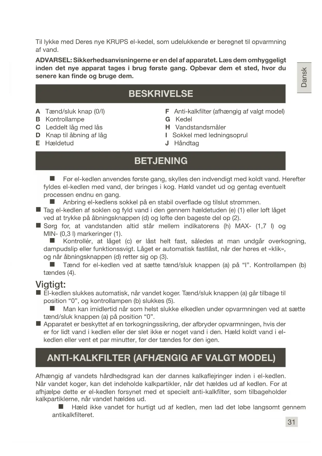 Til lykke med Deres nye KRUPS el-kedel, som udelukkende er beregnet til opvarmning