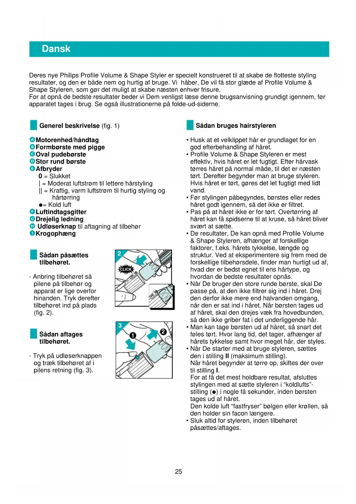 afkøling kan styleren anvendes igen. Før apparatet bruges igen, kontrolleres det, at