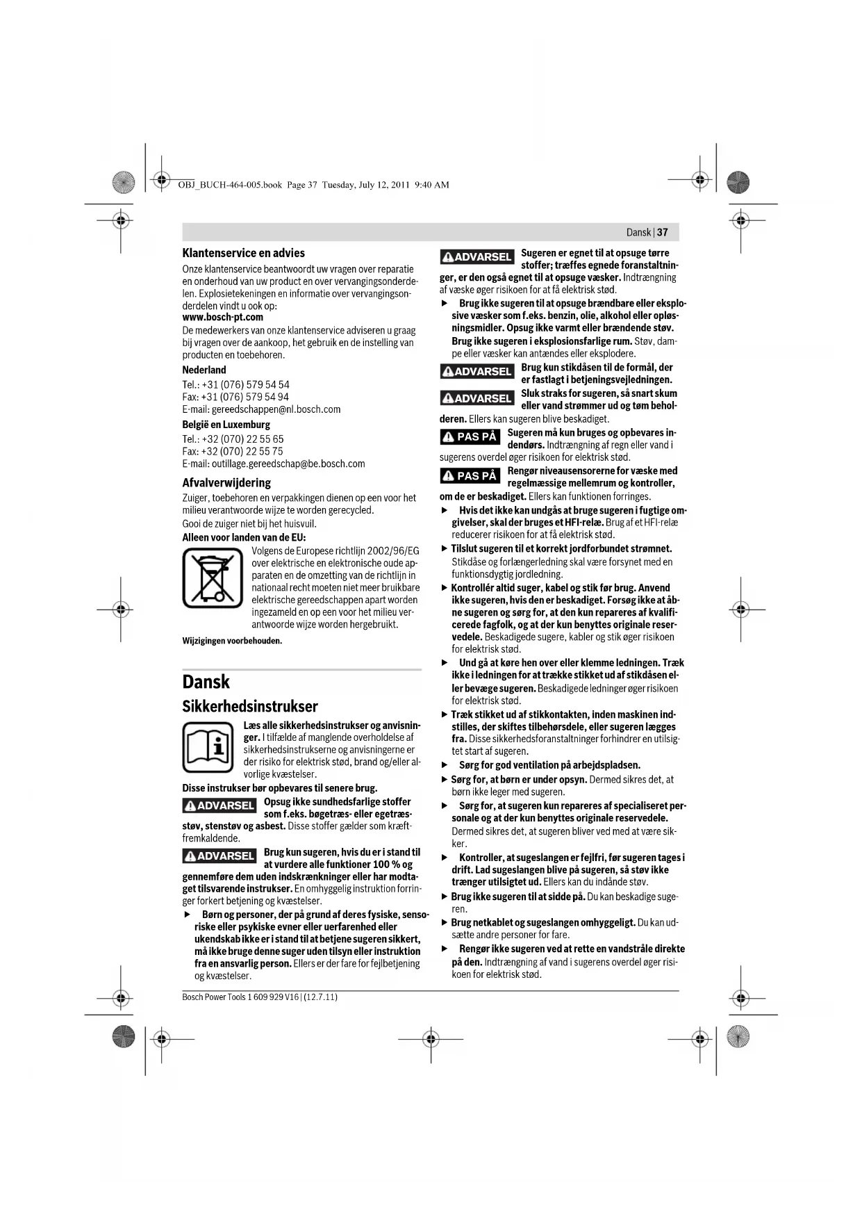 OBJ_BUCH-464-005.book Page 39 Tuesday, July 12, 2011 9:40 AM40 | Dansk 1 609 929 V16 | (12.7.11) Bosch Power Tools Bemærk: Fjern før vådsugningen støvposen 11 og tøm behol-