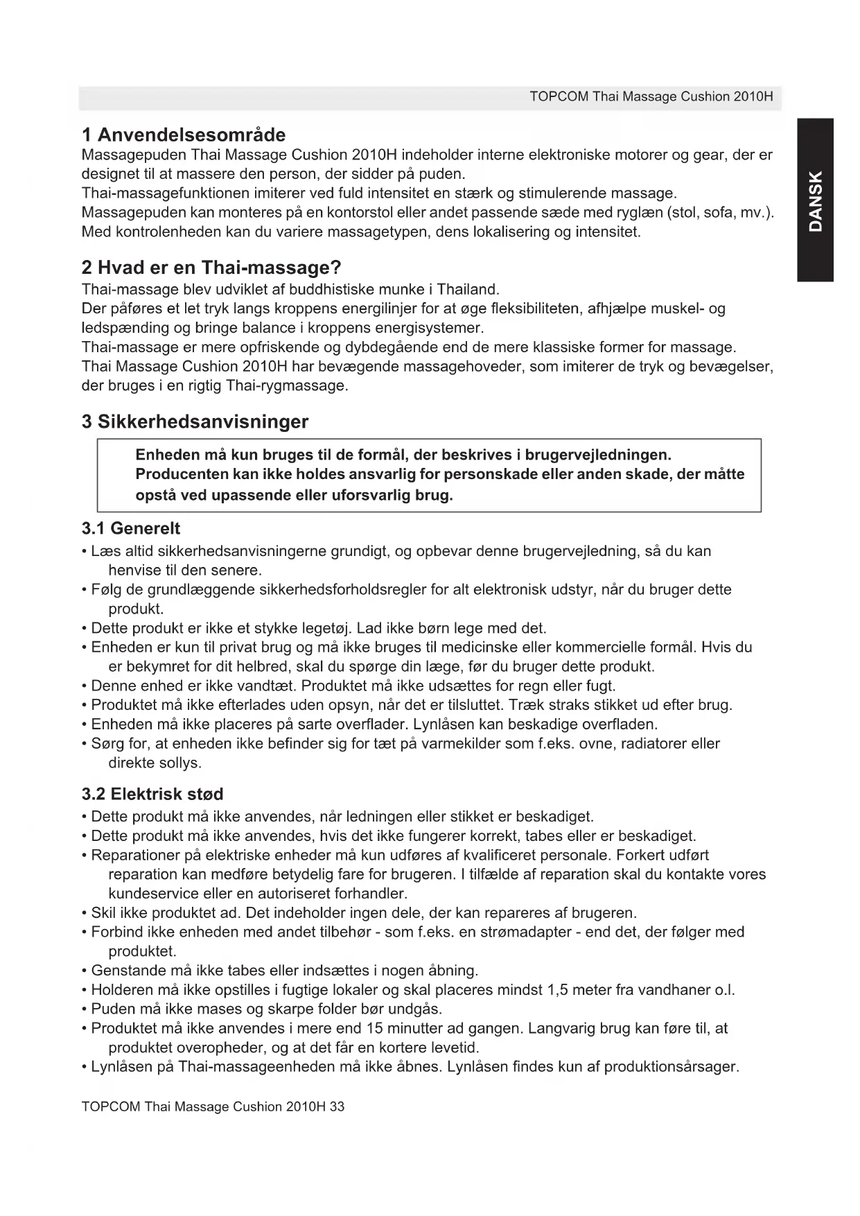 - Lynlåsen på Thai-massageenheden må ikke åbnes. Lynlåsen findes kun af produktionsårsager. Enheden må kun bruges til de formål, der beskrives i brugervejledningen. Producenten kan ikke holdes ansvarlig for personskade eller anden skade, der måtte opstå ved upassende eller uforsvarlig brug. HL_TMC-2010H D164.book Page 33 Friday, May 29, 2009 9:30 AM34 TOPCOM Thai Massage Cushion 2010H TOPCOM Thai Massage Cushion 2010H