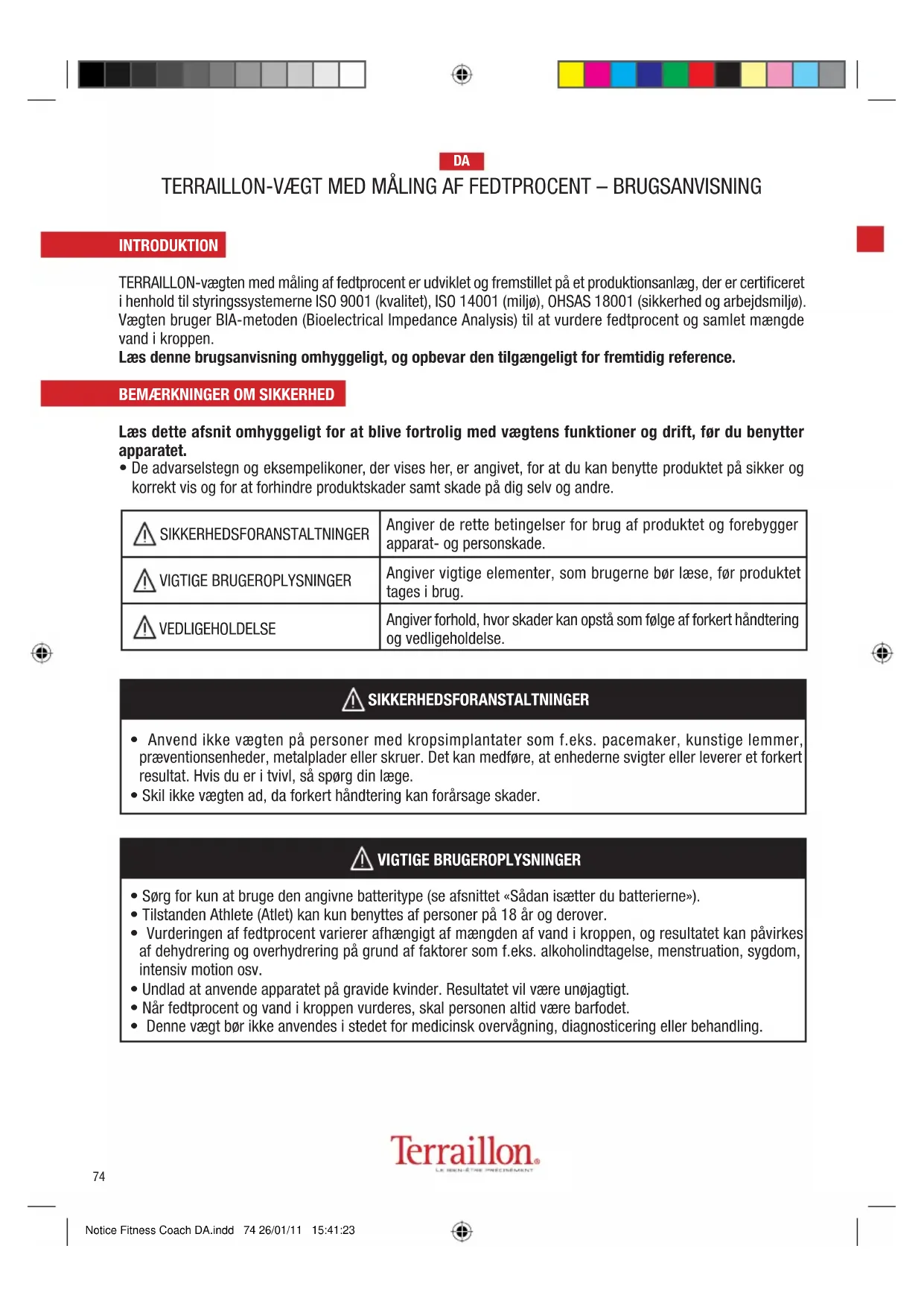 Notice Fitness Coach DA.indd 78 26/01/11 15:41:24TERRAILLON-VÆGT MED MÅLING AF FEDTPROCENT – BRUGSANVISNING DA