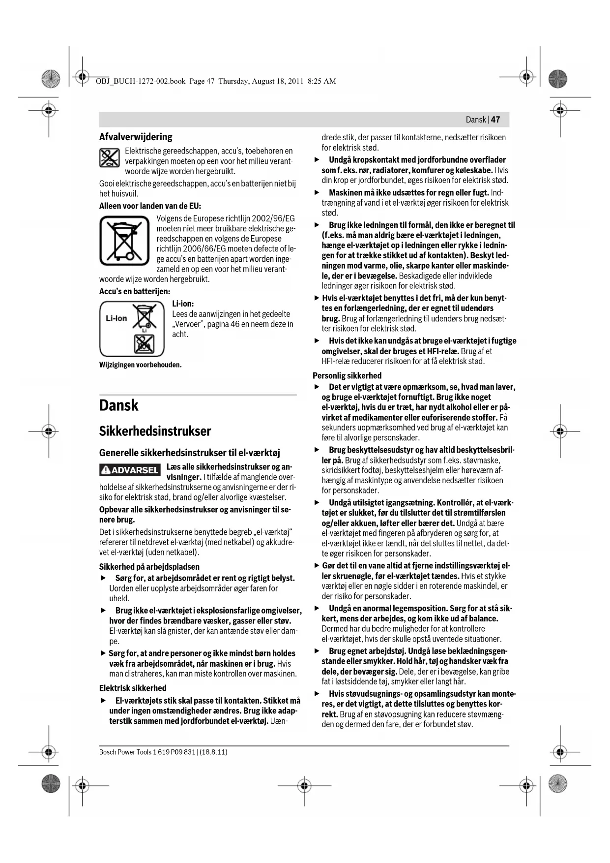OBJ_BUCH-1272-002.book Page 51 Thursday, August 18, 2011 8:25 AM52 | Svenska 1 619 P09 831 | (18.8.11) Bosch Power Tools Smid ikke el-værktøj og akkuer/batterier ud sammen med det