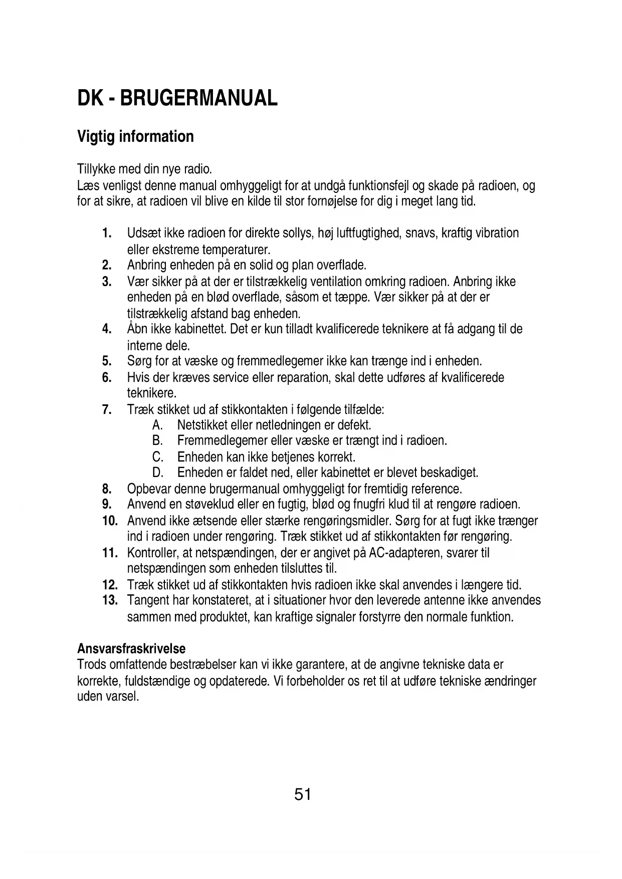 12. Træk stikket ud af stikkontakten hvis radioen ikke skal anvendes i længere tid.