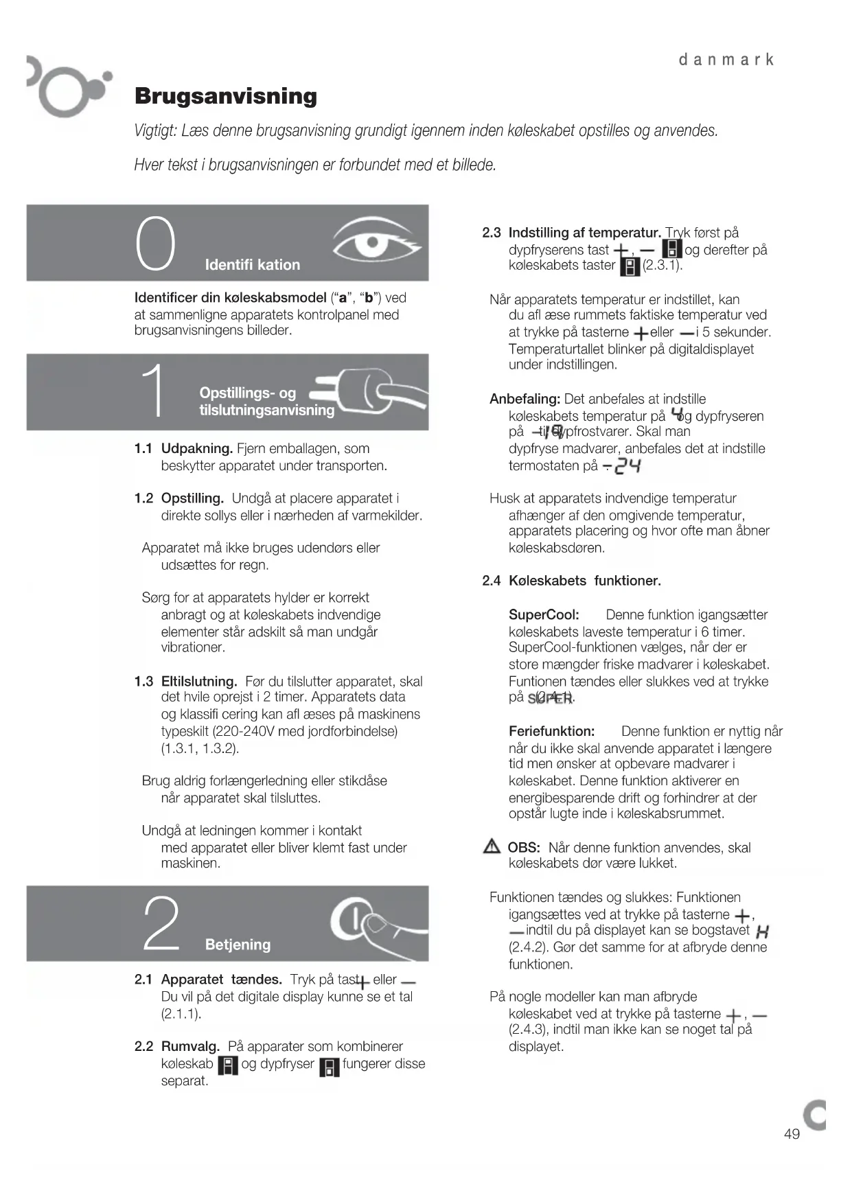 Vigtigt: Læs denne brugsanvisning grundigt igennem inden køleskabet opstilles og anvendes.