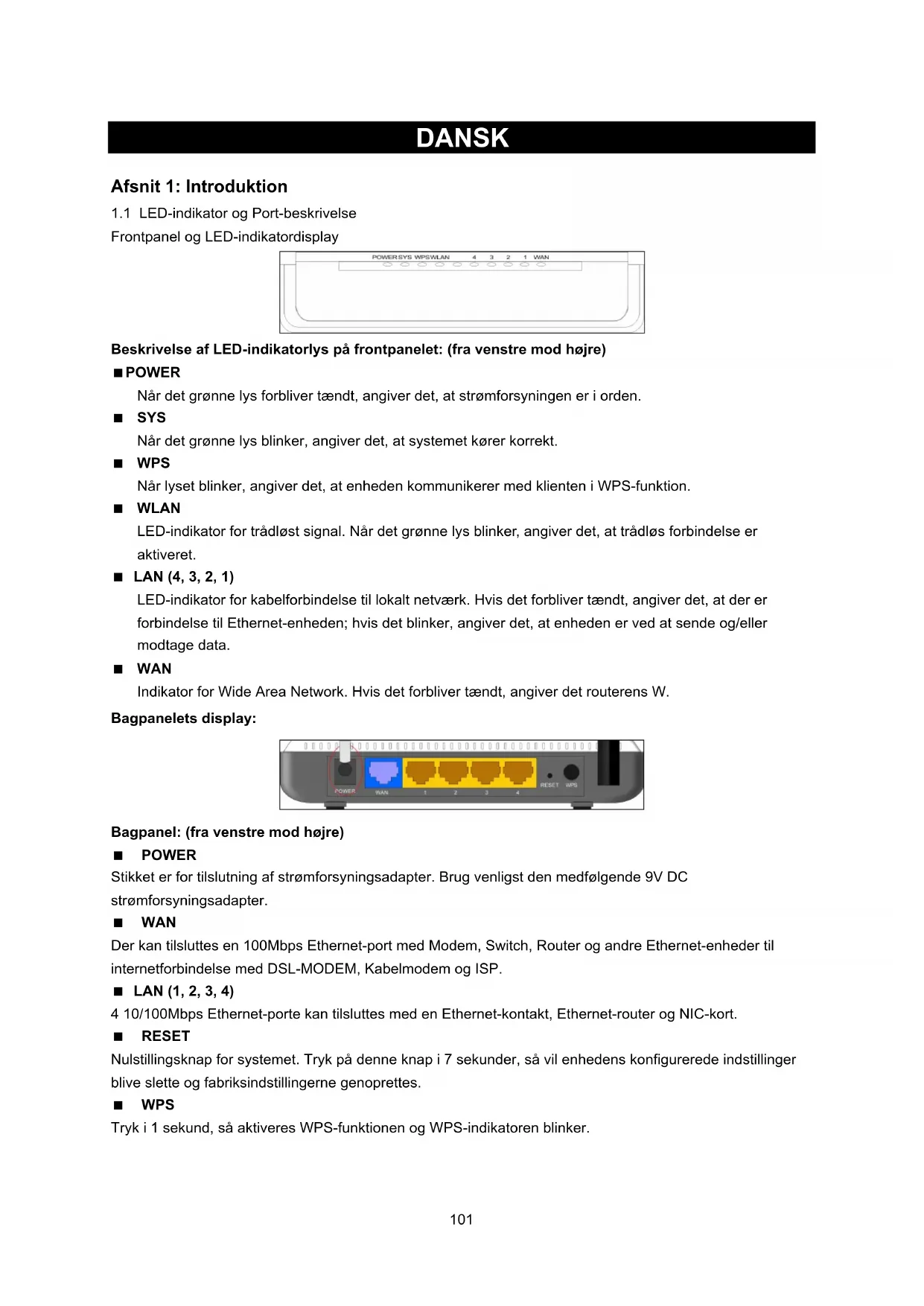 Frontpanel og LED-indikatordisplay Beskrivelse af LED-indikatorlys på frontpanelet: (fra venstre mod højre) POWER Når det grønne lys forbliver tændt, angiver det, at strømforsyningen er i orden. SYS Når det grønne lys blinker, angiver det, at systemet kører korrekt. WPS Når lyset blinker, angiver det, at enheden kommunikerer med klienten i WPS-funktion. WLAN LED-indikator for trådløst signal. Når det grønne lys blinker, angiver det, at trådløs forbindelse er aktiveret. LAN (4, 3, 2, 1) LED-indikator for kabelforbindelse til lokalt netværk. Hvis det forbliver tændt, angiver det, at der er forbindelse til Ethernet-enheden; hvis det blinker, angiver det, at enheden er ved at sende og/eller modtage data. WAN Indikator for Wide Area Network. Hvis det forbliver tændt, angiver det routerens W. Bagpanelets display: Bagpanel: (fra venstre mod højre) POWER Stikket er for tilslutning af strømforsyningsadapter. Brug venligst den medfølgende 9V DC strømforsyningsadapter. WAN Der kan tilsluttes en 100Mbps Ethernet-port med Modem, Switch, Router og andre Ethernet-enheder til internetforbindelse med DSL-MODEM, Kabelmodem og ISP. LAN (1, 2, 3, 4) 4 10/100Mbps Ethernet-porte kan tilsluttes med en Ethernet-kontakt, Ethernet-router og NIC-kort. RESET Nulstillingsknap for systemet. Tryk på denne knap i 7 sekunder, så vil enhedens konfigurerede indstillinger blive slette og fabriksindstillingerne genoprettes. WPS Tryk i 1 sekund, så aktiveres WPS-funktionen og WPS-indikatoren blinker.102 Afsnit 2: Hardware-installation