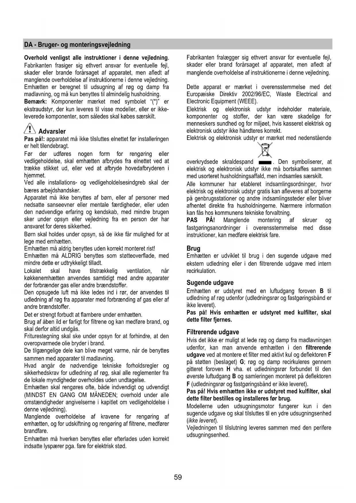 Emhætten må hverken benyttes eller efterlades uden korrekt
