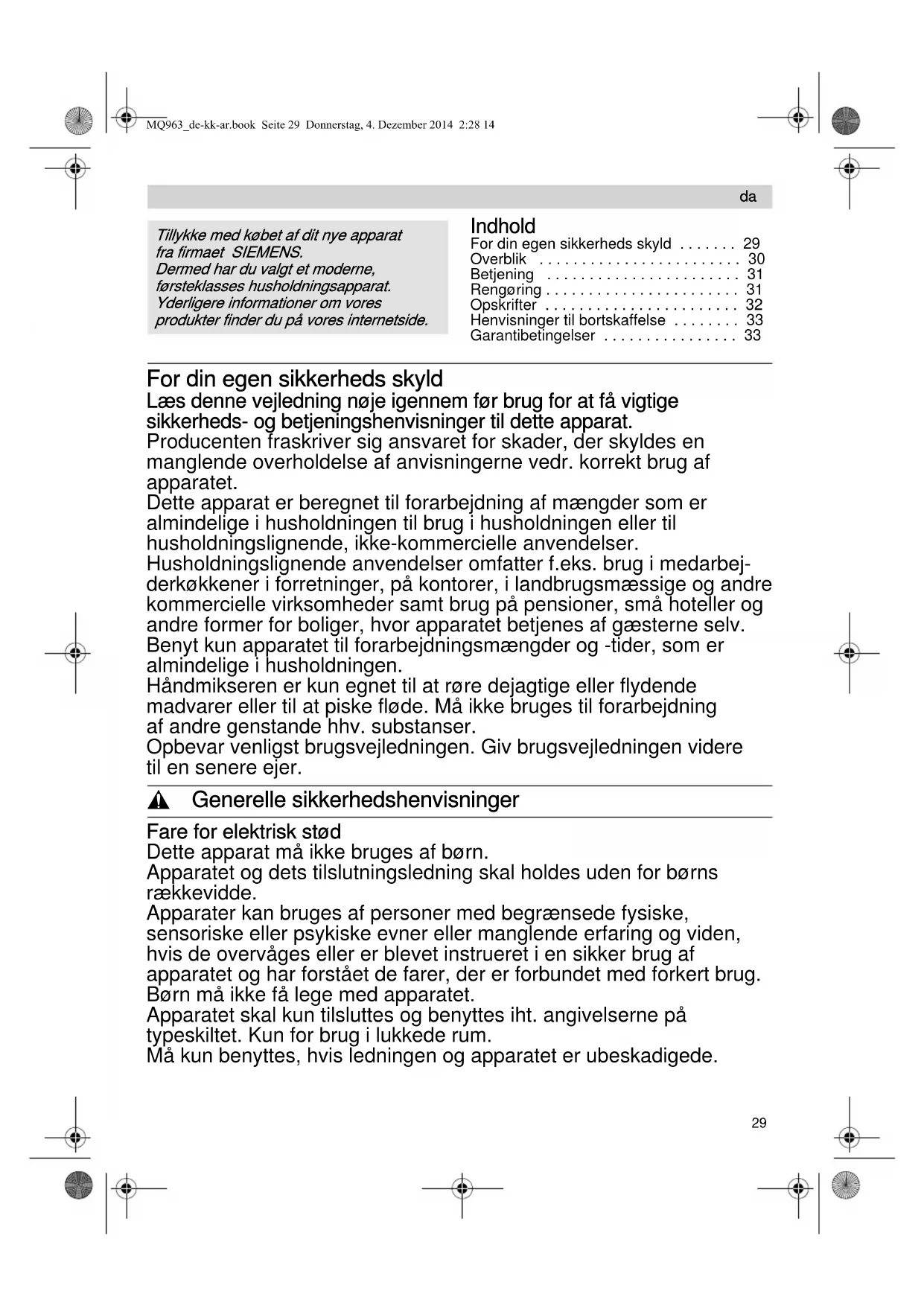 Indhold For din egen sikkerheds skyld . . . . . . . 29Overblik . . . . . . . . . . . . . . . . . . . . . . . . 30Betjening . . . . . . . . . . . . . . . . . . . . . . . 31Rengøring . . . . . . . . . . . . . . . . . . . . . . . 31Opskrifter . . . . . . . . . . . . . . . . . . . . . . . 32Henvisninger til bortskaffelse . . . . . . . . 33Garantibetingelser . . . . . . . . . . . . . . . . 33 For din egen sikkerheds skyld