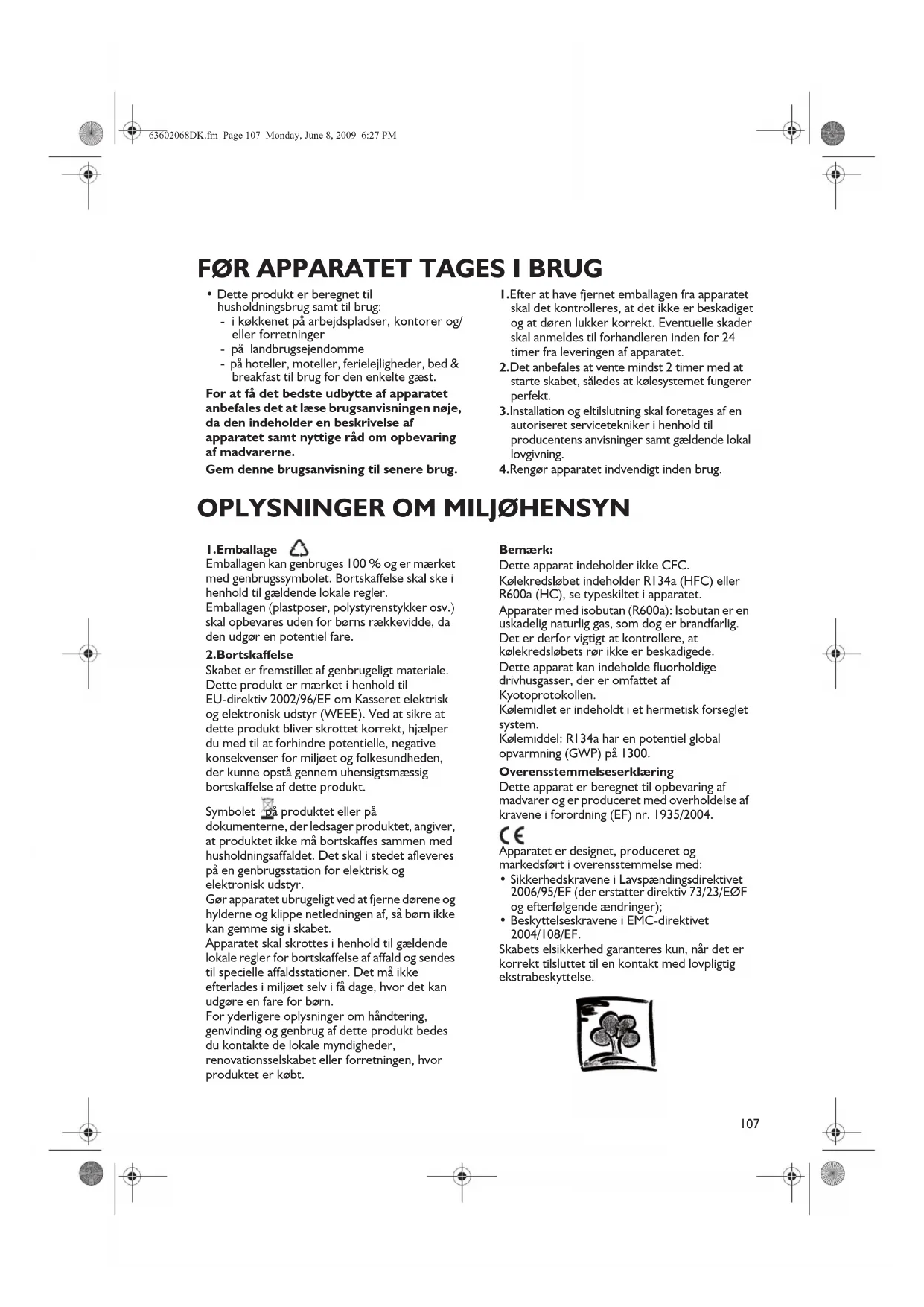 FØR APPARATET TAGES I BRUG OPLYSNINGER OM MILJØHENSYN