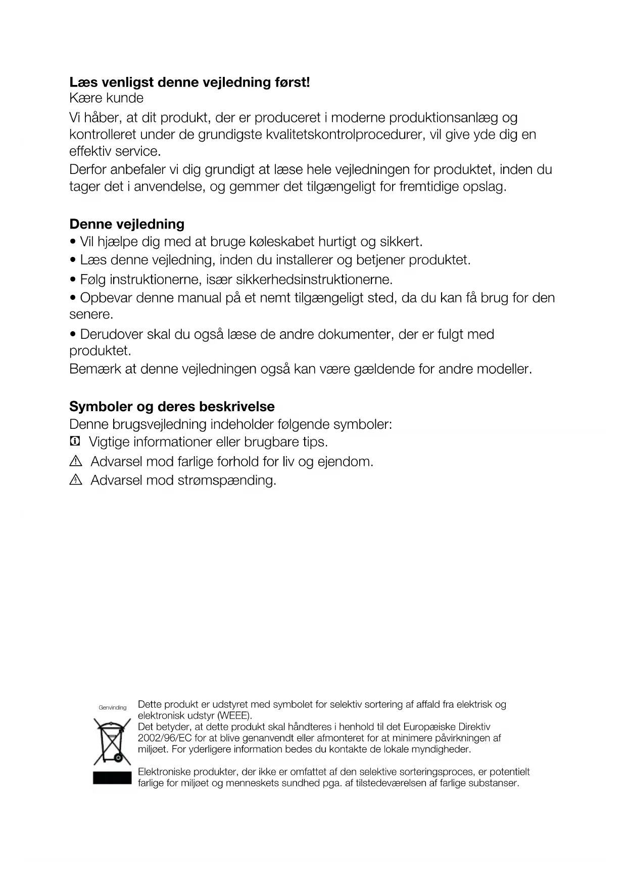 - Żywnośćdotykasufituszuflady.Zmieńcieułożenieżywnościw szufladzie.Læs venligst denne vejledning først! Kære kunde Vi håber, at dit produkt, der er produceret i moderne produktionsanlæg og kontrolleret under de grundigste kvalitetskontrolprocedurer, vil give yde dig en effektiv service. Derfor anbefaler vi dig grundigt at læse hele vejledningen for produktet, inden du tager det i anvendelse, og gemmer det tilgængeligt for fremtidige opslag. Denne vejledning