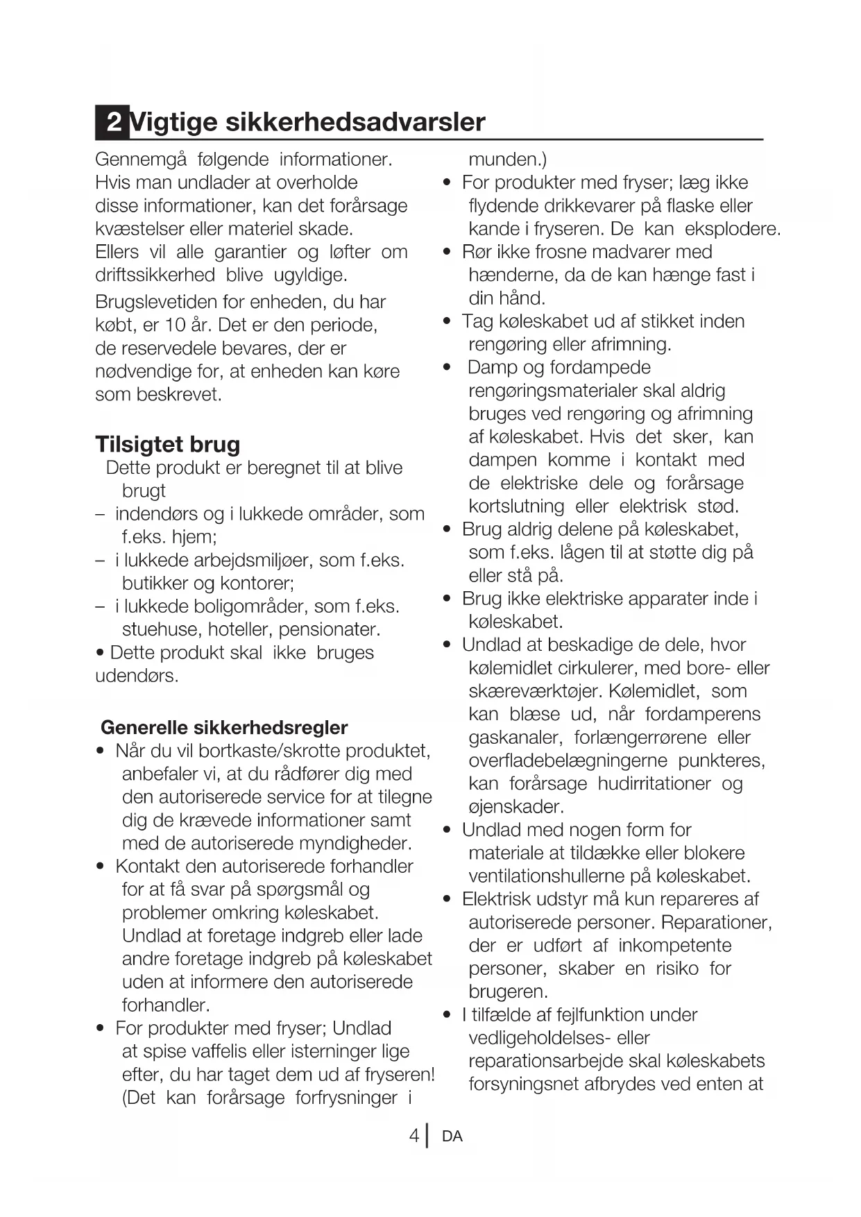 - Dette køleskab er kun beregnet til at opbevare madvarer. Det bør ikke bruges til andre formål.
