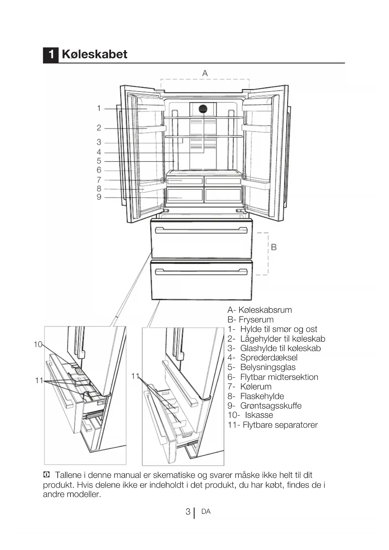 1 Køleskabet A- Køleskabsrum B- Fryserum