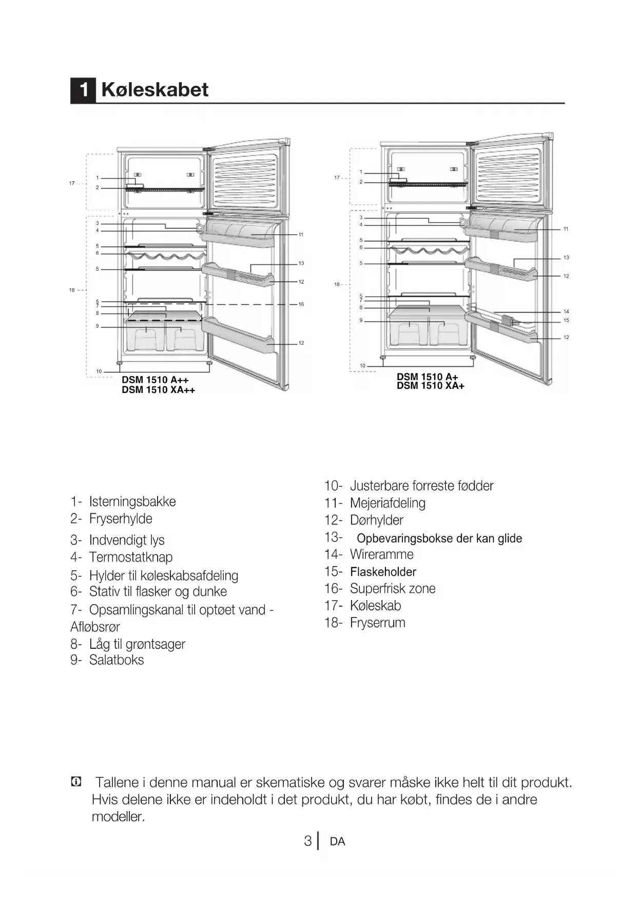 C Tallene i denne manual er skematiske og svarer måske ikke helt til dit produkt. Hvis delene ikke er indeholdt i det produkt, du har købt, findes de i andre modeller. 1 Køleskabet