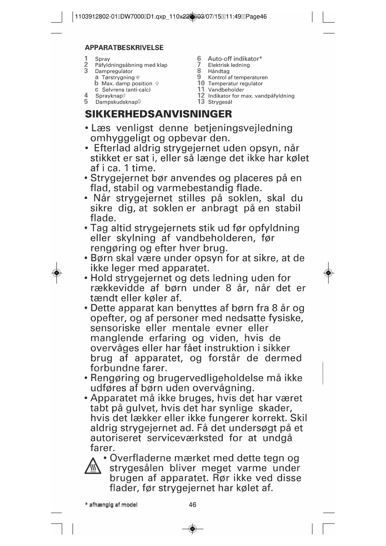 1103912802-01DW7000D1.qxp_110x22003/07/1511:49Page46IBRUGTAGNING Advarsel! Fjern eventuelle etiketter på strygesålen, før strygejernet tændes