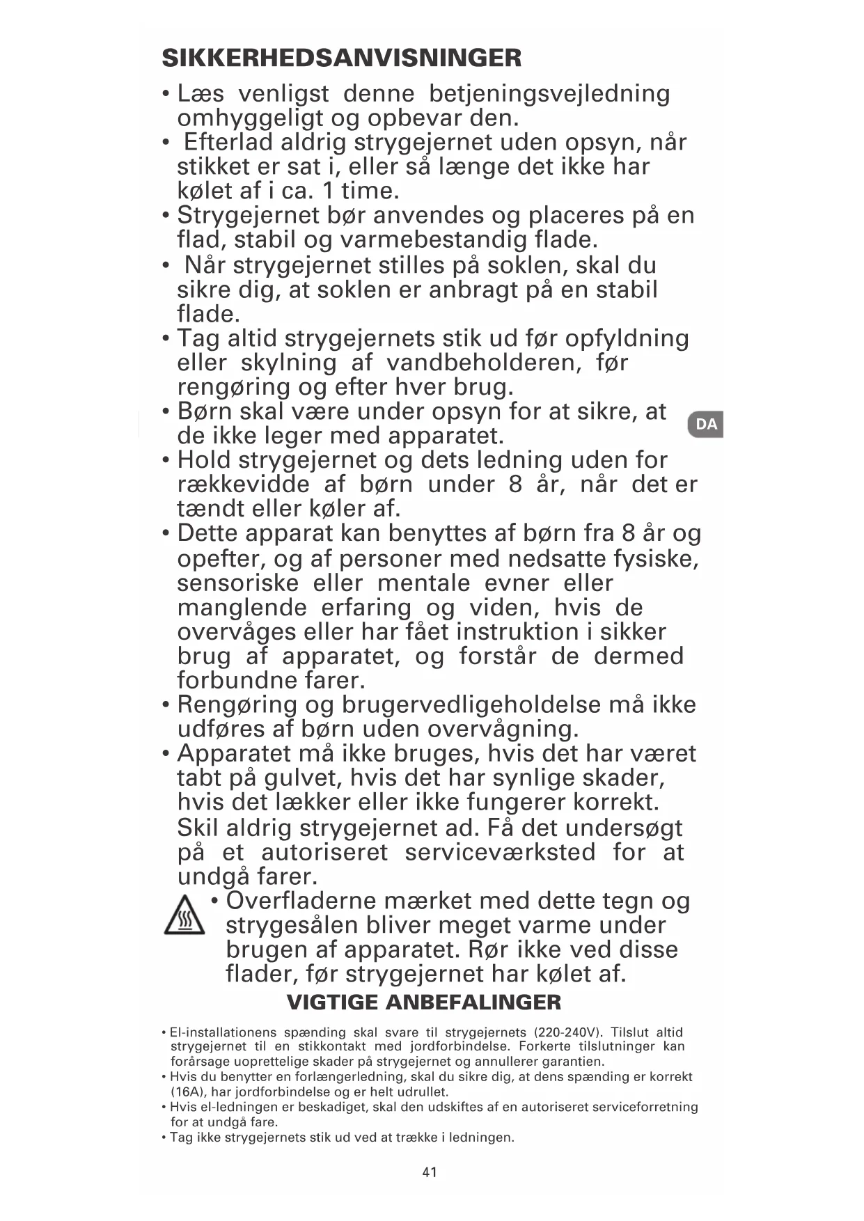 • El-installationens spænding skal svare til strygejernets (220-240V). Tilslut altid