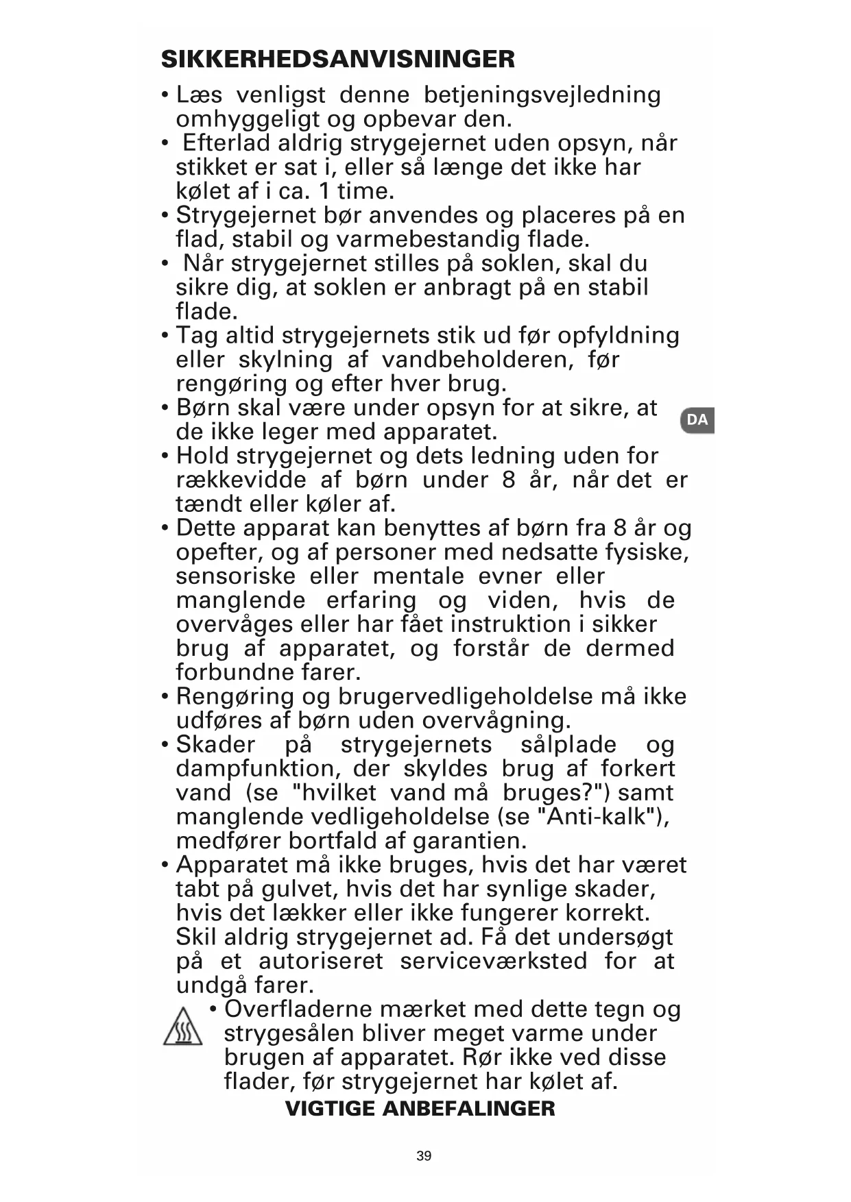 • Dette strygejern er kun beregnet til brug i en almindelig husholdning. Fabrikanten