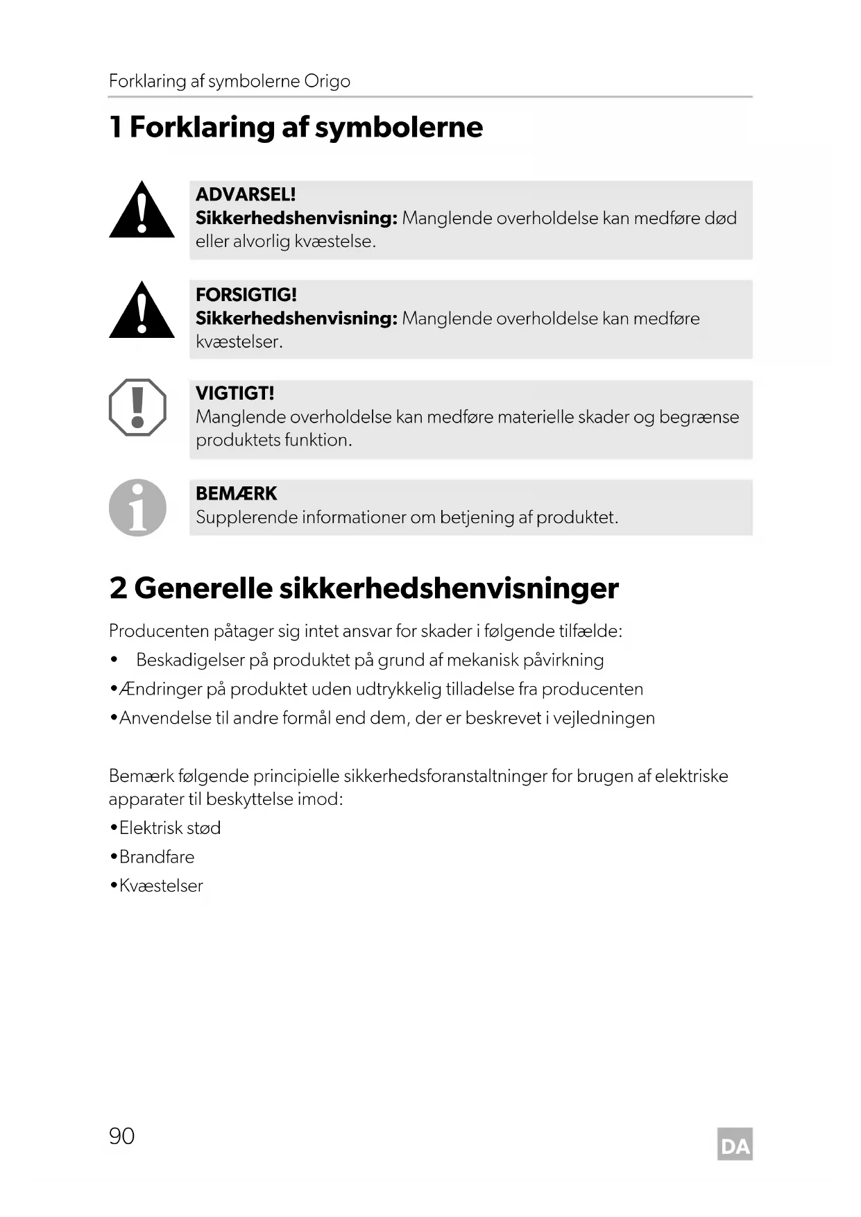 Origo_2000_4100.book Seite 91 Freitag, 6. Januar 2017 11:40 11DA Generelle sikkerhedshenvisninger Origo