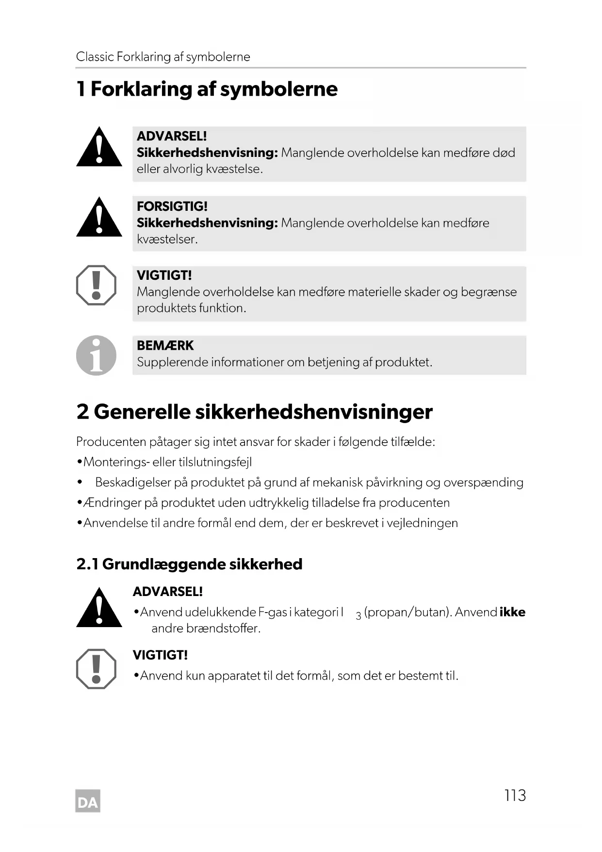 - Anvend udelukkende F-gas i kategori I _3 (propan/butan). Anvend ikke andre brændstoffer.