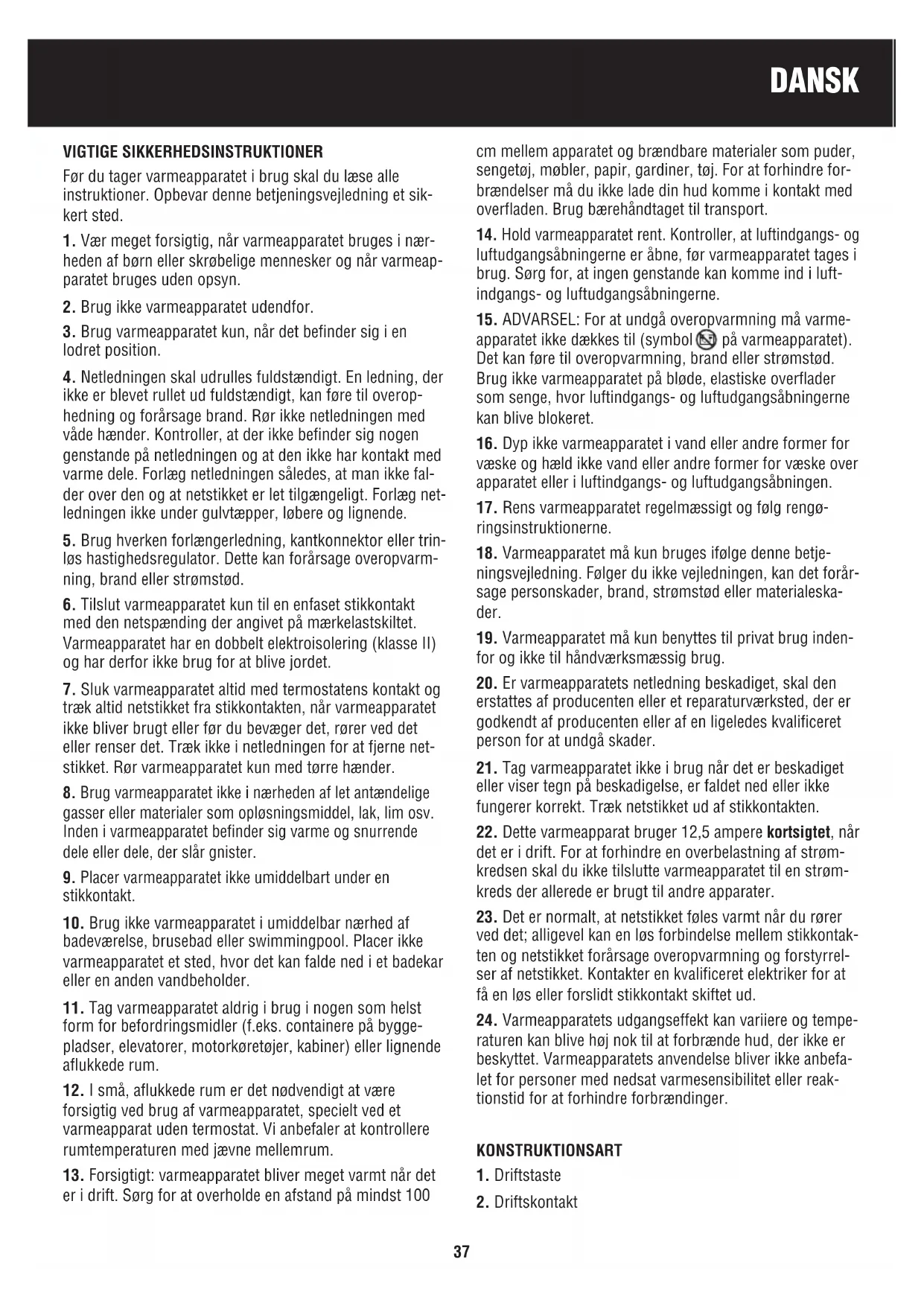 DANSK VIGTIGE SIKKERHEDSINSTRUKTIONER Før du tager varmeapparatet i brug skal du læse alle