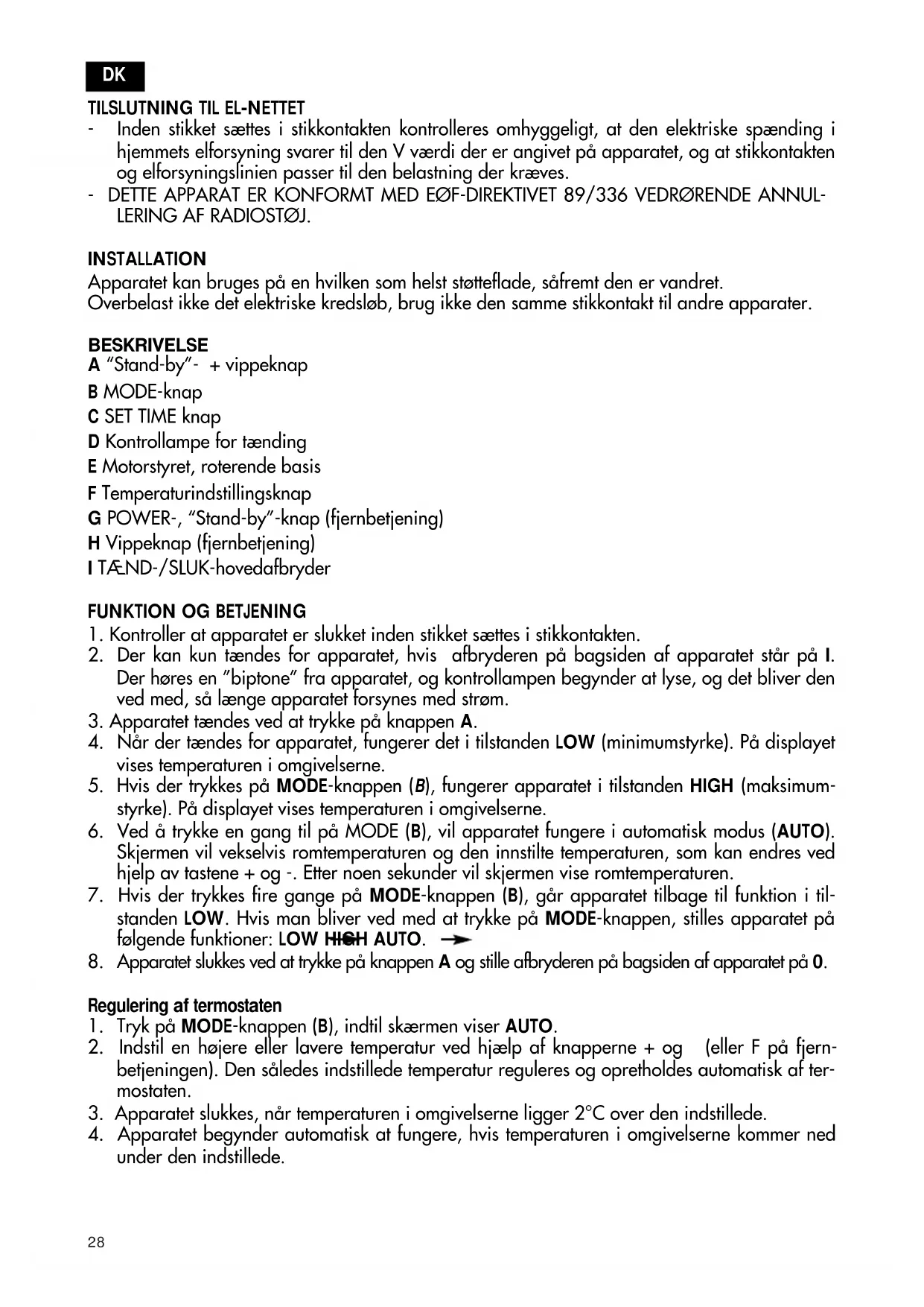 HB) og temperaturindstilling (knap F), jævnfør afsnittet FUNKTION OG BETJENING.
