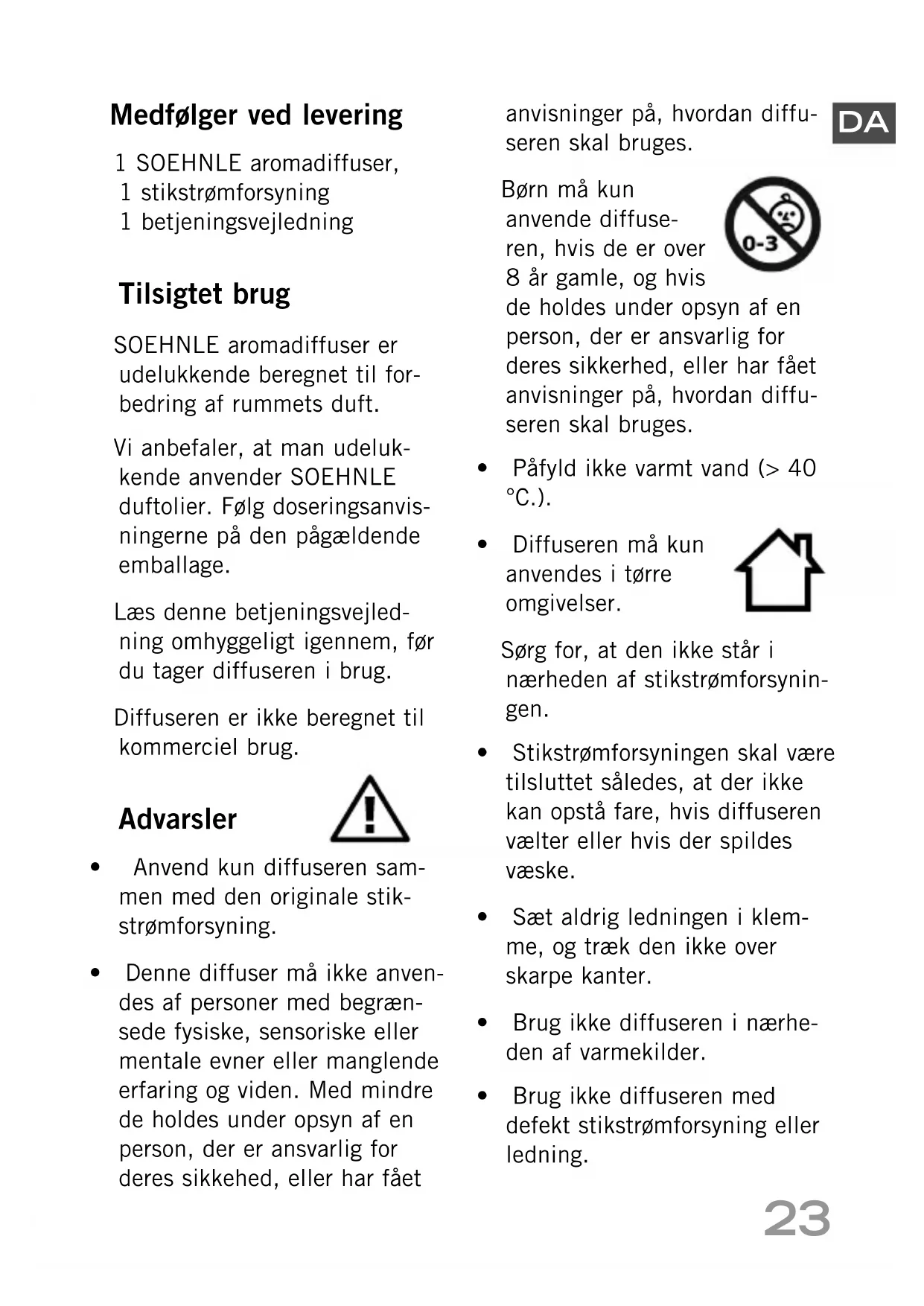Medfølger ved levering 1 SOEHNLE aromadiffuser, 1 stikstrømforsyning 1 betjeningsvejledning Tilsigtet brug SOEHNLE aromadiffuser er udelukkende beregnet til for- bedring af rummets duft. Vi anbefaler, at man udeluk- kende anvender SOEHNLE duftolier. Følg doseringsanvis- ningerne på den pågældende emballage. Læs denne betjeningsvejled- ning omhyggeligt igennem, før du tager diffuseren i brug. Diffuseren er ikke beregnet til kommerciel brug. Advarsler