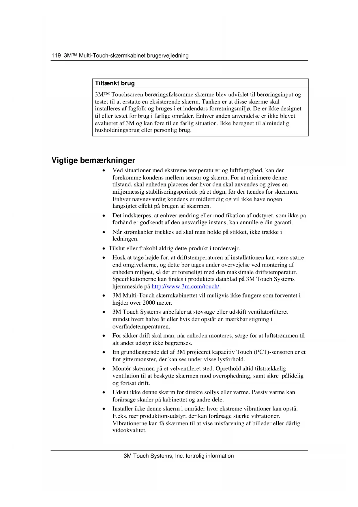 Vigtige bemærkninger Ved situationer med ekstreme temperaturer og luftfugtighed, kan der forekomme kondens mellem sensor og skærm. For at minimere denne tilstand, skal enheden placeres der hvor den skal anvendes og gives en miljømæssig stabiliseringsperiode på et døgn, før der tændes for skærmen. Enhver nævneværdig kondens er midlertidig og vil ikke have nogen langsigtet effekt på brugen af skærmen. Det indskærpes, at enhver ændring eller modifikation af udstyret, som ikke på forhånd er godkendt af den ansvarlige instans, kan annullere din garanti. Når strømkabler trækkes ud skal man holde på stikket, ikke trække i ledningen. Tilslut eller frakobl aldrig dette produkt i tordenvejr. Husk at tage højde for, at driftstemperaturen af installationen kan være større end omgivelserne, og dette bør tages under overvejelse ved montering af enheden miljøet, så det er foreneligt med den maksimale driftstemperatur. Specifikationerne kan findes i produktets datablad på 3M Touch Systems hjemmeside på http://www.3m.com/touch/. 3M Multi-Touch skærmkabinettet vil muligvis ikke fungere som forventet i højder over 2000 meter. 3M Touch Systems anbefaler at støvsuge eller udskift ventilatorfilteret mindst hvert halve år eller hvis der opstår en mærkbar stigning i overfladetemperaturen. For sikker drift skal man, når enheden monteres, sørge for at luftstrømmen til alt andet udstyr ikke begrænses. En grundlæggende del af 3M projiceret kapacitiv Touch (PCT)-sensoren er et fint gittermønster, der kan ses under visse lysforhold. Montér skærmen på et velventileret sted. Oprethold altid tilstrækkelig ventilation til at beskytte skærmen mod overophedning, samt sikre pålidelig og fortsat drift. Udsæt ikke denne skærm for direkte sollys eller varme. Passiv varme kan forårsage skader på kabinettet og andre dele. Installer ikke denne skærm i områder hvor ekstreme vibrationer kan opstå. F.eks. nær produktionsudstyr, der kan forårsage stærke vibrationer. Vibrationerne kan få skærmen til at vise misfarvning af billeder eller dårlig videokvalitet.120 3M™ Multi-Touch-skærmkabinet brugervejledning 3M Touch Systems, Inc. fortrolig information De 3M touch-controllere, der er nævnt i dette dokument er USB-kompatible fuldhastighedsenheder. 3M garanterer ikke at vi er USB-kompatible i henhold til USB- specifikationerne. Køleventilator kører periodevist afhængigt af den interne temperatur. Når den interne temperatur bliver højere end omgivelserne, tændes ventilatoren. Systemet vil lukke ned, når den indvendige temperatur når et kritisk niveau. Indikatorer for service og reparation Forsøg ikke selv at udføre servicearbejde på enheden med undtagelse af udskiftning af filter. Tag strømkablet til skærmen ud af stikkontakten og kontakt en autoriseret servicetekniker, hvis: Produktet udsættes for væske. Produktet fungerer ikke korrekt, når brugsanvisningen følges. Produktet mærkbart opfører sig anderledes end normalt, hvilket indikerer et behov for eftersyn. Strømkablet eller -stikket er beskadiget eller flosset. Procedure for udskiftning af filter 3M Touch Systems anbefaler at støvsuge eller udskift ventilatorfilteret mindst hvert halve år eller hvis der opstår en mærkbar stigning i overfladetemperaturen. Fjern skruerne fra filterdækslet. Afmonter filterdækslet og filtret Udskift filteret (brug 3M-filter # 98-1100-0230-4) Genmonter dækslet