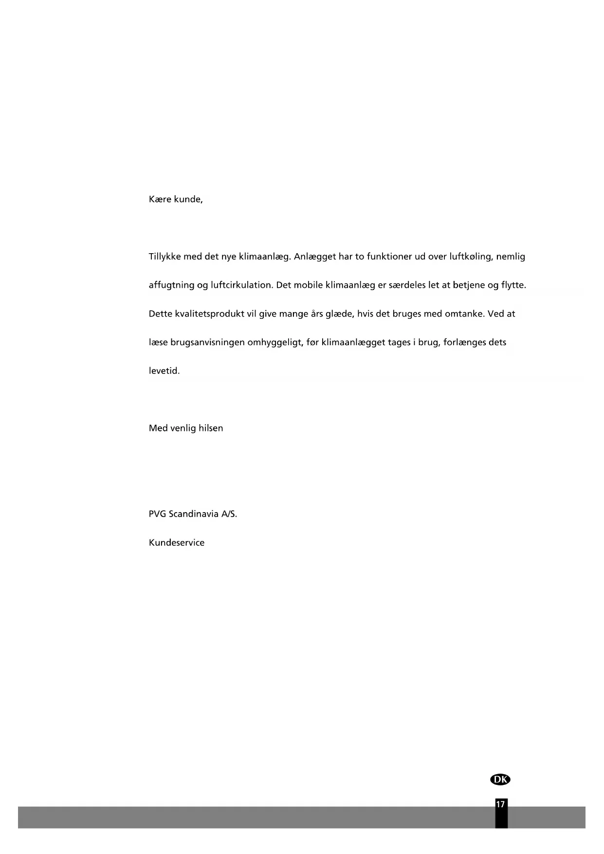 Kære kunde, Tillykke med det nye klimaanlæg. Anlægget har to funktioner ud over luftkøling, nemlig affugtning og luftcirkulation. Det mobile klimaanlæg er særdeles let at betjene og flytte. Dette kvalitetsprodukt vil give mange års glæde, hvis det bruges med omtanke. Ved at læse brugsanvisningen omhyggeligt, før klimaanlægget tages i brug, forlænges dets levetid. Med venlig hilsen PVG Scandinavia A/S. KundeserviceA SIKKERHEDSFORSKRIFTER Installationen skal være udført helt i overensstemmelse med lokalt gældende forskrifter, bestemmelser og standarder. Apparatet er kun beregnet til indendørs brug på tørre steder. Kontroller netspændingen. Dette apparat er kun egnet til en