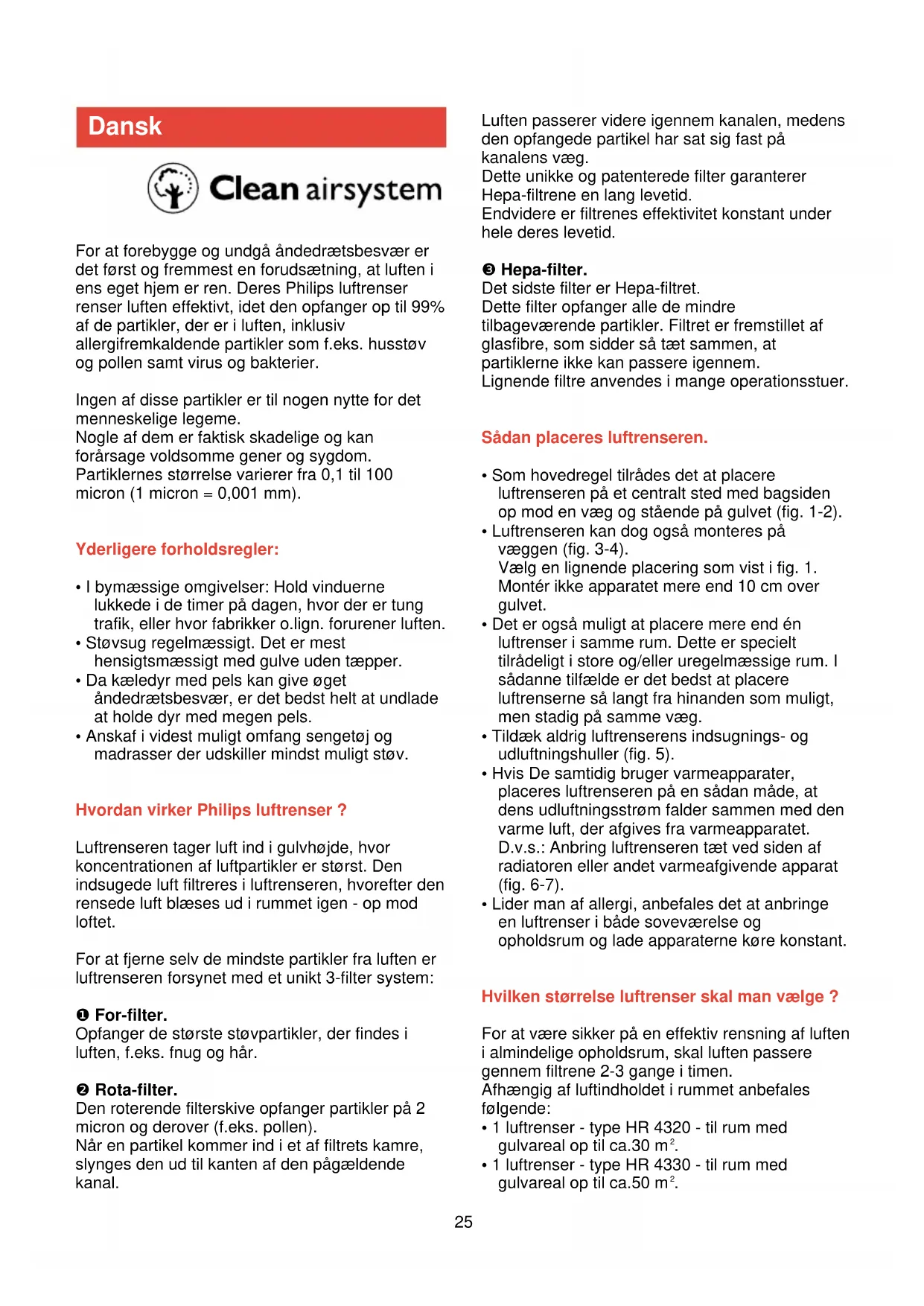 - Luftforholdene i rummet. Sådan tages filtrene ud: - Sæt hastighedsomskifteren i stilling O (fig. 9). - Tag stikket ud af stikkontakten. - Tag frontdækslet af (fig. 10). - Tag Hepa-filtrene ud (fig. 11). - Vend Hepa-filtrene om. - Sammenlign farven på undersiderne af filtrene med farverne på indikatoren for "fyldt filter" (fig. 12). - Udskift Hepa-filtrene hvis farven på dem svarer til den mørkeste grå farve på indikatoren (fig. 13). - Tag forfiltret ud (fig. 14). - Tag Rota-filtret ud (fig. 15). Filtrene sættes tilbage på plads i modsat rækkefølge.27 Sikkerhedslås. Frontdækslet er forsynet med en sikkerhedslås, der forhindrer, at dækslet kan tages af, når luftrenseren er tændt. Sikkerhedslåsen forhindrer samtidig, at der kan tændes for apparatet, hvis frontdækslet er taget af. Rengøring af forfilter og Rota-filter: - Vask (fig. 16) eller støvsug forfiltret. Fnug og hår kan fjernes med en blød børste. - Vask (fig. 17) eller støvsug Rota-filtret. Bruges vaskemiddel, skal filtrene skylles efter med rent, varmt vand (fig. 18). Lad filtrene lufttørre helt (fig. 19) før de sættes i igen. Rota-filtret kan også vaskes i opvaskemaskine. Udskiftning af Hepa-filtrene: Nye Hepa-filtre, typenr. HR 4920, kan købes hos Deres forhandler. Automatisk overophedningssikring. For at undgå beskadigelse af luftrenseren og nedsætte risikoen for ulykker, er apparatet forsynet med en sikkerhedsafbryder, der slukker for den indbyggede ventilationsmotor, hvis den bliver for varm. For at vise, at der stadig er tændt for luftrenseren, bliver kontrollampen dog ved med at lyse. Hvis dette sker: - Sæt hastighedsomskifteren i stilling O (= slukket). - Tag stikket ud af stikkontakten (kontrollampen slukker). - Vent til motoren er afkølet (det tager ca. 15 minutter). - Luk apparatet op. Kontrollér, at filtrene ikke er blokerede, og at der ikke er noget, der forhindrer den frie luftstrøm. - Kontrollér, at Rota-filtret kan dreje frit rundt ved at dreje det med hånden (fig. 20). - Luk apparatet igen. Sæt stikket i stikkontakten og tænd for stikkontakt og luftrenser. Hvis den automatiske sikkerhedsafbryder træder i funktion for tit, anbefales det at rette henvendelse til Deres forhandler for at få luftrenseren efterset.For å hindre pustevansker, er ren luft i Deres hjem en nødvendighet. Deres Philips luftrenser hjelper Dem å rense luften ved å fange opptil 99 % av de luftpartiklene. Dette inkluderer allergener slik som husstøv og pollen, så vel som virus og bakterier. Ingen av disse partiklene er hensiktsmessig for kroppen vår. Noen av disse er faktisk veldig skadelige og kan forårsake alvorlige plager og sykdommer. Partiklene varierer i størrelse fra 0,1 til 100 micron. (1 micron = 0,001 mm) Spesielle forholdsregler