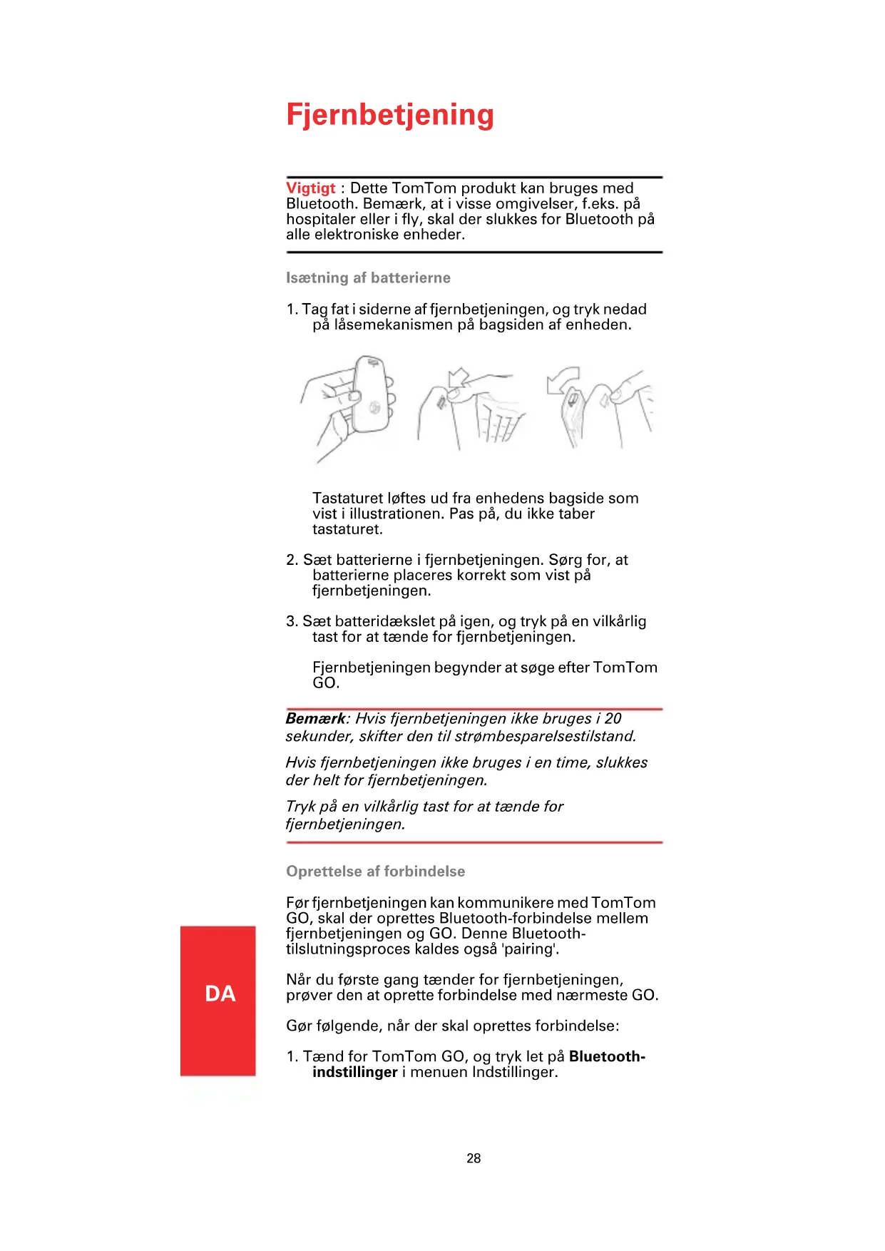 tast for at tænde for fjernbetjeningen. Fjernbetjeningen begynder at søge efter TomTom GO. Bemærk: Hvis fjernbetjeningen ikke bruges i 20 sekunder, skifter den til strømbesparelsestilstand. Hvis fjernbetjeningen ikke bruges i en time, slukkes der helt for fjernbetjeningen. Tryk på en vilkårlig tast for at tænde for fjernbetjeningen. Oprettelse af forbindelse Før fjernbetjeningen kan kommunikere med TomTom GO, skal der oprettes Bluetooth-forbindelse mellem fjernbetjeningen og GO. Denne Bluetooth- tilslutningsproces kaldes også 'pairing'. Når du første gang tænder for fjernbetjeningen, prøver den at oprette forbindelse med nærmeste GO. Gør følgende, når der skal oprettes forbindelse: