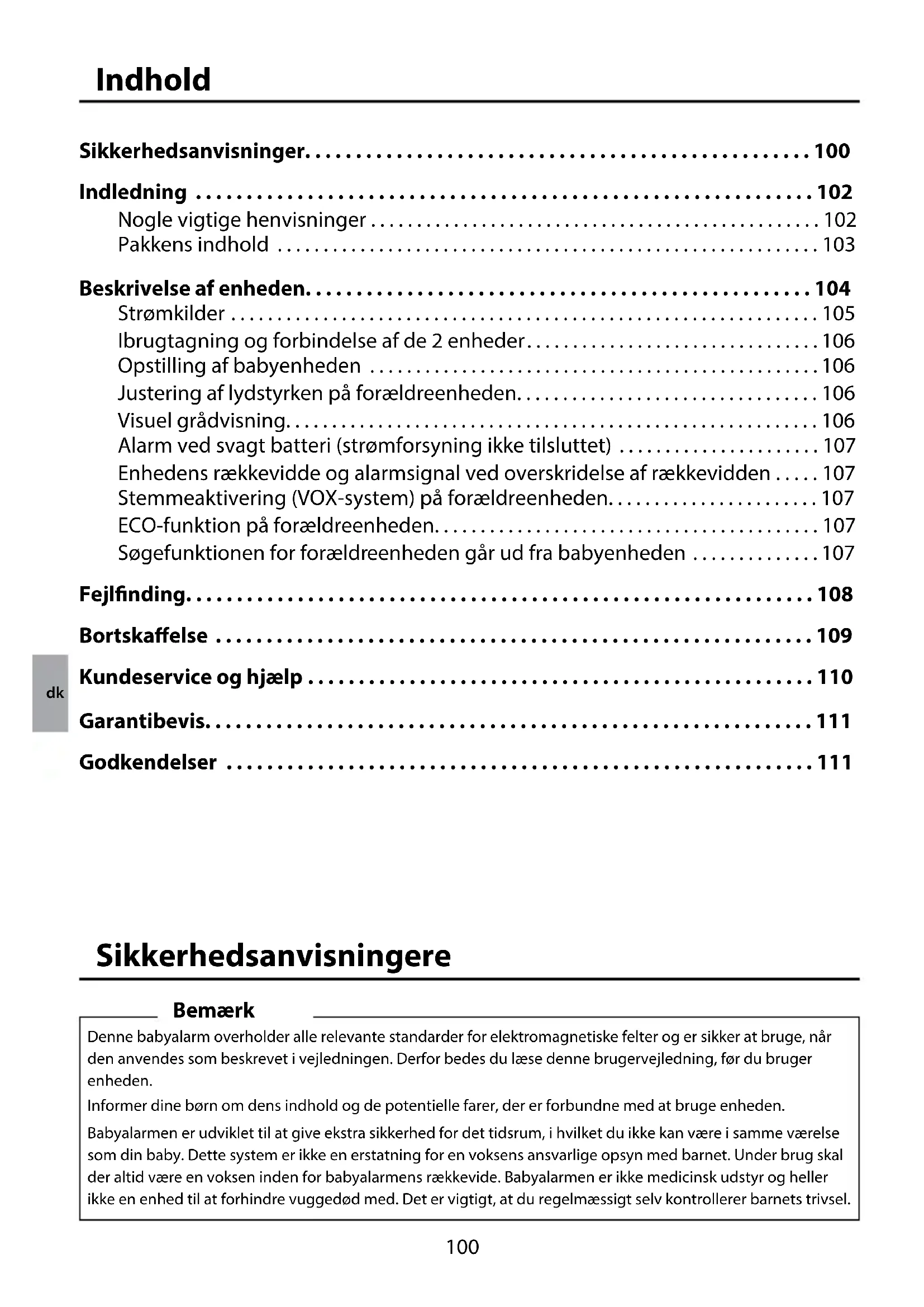 - Bestemmelsene ovenfor endrer ikke reglene om bevisbyrde til ulempe for kunden. For å gjøre denne garantien gjeldende må du kontakte Gigaset Communications. Bruksområde Dette apparatet er godkjent for bruk over hele verden. Utenfor Europeisk Økonomisk Samarbeidsområdelandene (unntatt Sveits) er bruken avhengig av nasjonale godkjennelser. Landsspesikke krav er tatt høyde for. Vi, Gigaset Communications GmbH, erklærer at denne enheten er i tråd med de krav og andre relaterte bestemmelser som er befestet i direktiv 1999/5/EF. En kopi av samsvarserklæring er tilgjengelig på denne nettsiden: www.gigaset.com/docs no100 Indhold Sikkerhedsanvisninger..................................................100 Indledning .............................................................102 Nogle vigtige henvisninger .................................................102 Pakkens indhold ...........................................................103 Beskrivelse af enheden..................................................104 Strømkilder ................................................................105 Ibrugtagning og forbindelse af de 2 enheder................................106 Opstilling af babyenheden .................................................106 Justering af lydstyrken på forældreenheden.................................106 Visuel grådvisning..........................................................106 Alarm ved svagt batteri (strømforsyning ikke tilsluttet) ......................107 Enhedens rækkevidde og alarmsignal ved overskridelse af rækkevidden .....107 Stemmeaktivering (VOX-system) på forældreenheden.......................107 ECO-funktion på forældreenheden..........................................107 Søgefunktionen for forældreenheden går ud fra babyenheden ..............107 Fejlnding..............................................................108 Bortskaelse ...........................................................109 Kundeservice og hjælp ..................................................110 Garantibevis............................................................111 Godkendelser ..........................................................111 Sikkerhedsanvisningere Denne babyalarm overholder alle relevante standarder for elektromagnetiske felter og er sikker at bruge, når den anvendes som beskrevet i vejledningen. Derfor bedes du læse denne brugervejledning, før du bruger enheden. Informer dine børn om dens indhold og de potentielle farer, der er forbundne med at bruge enheden. Babyalarmen er udviklet til at give ekstra sikkerhed for det tidsrum, i hvilket du ikke kan være i samme værelse som din baby. Dette system er ikke en erstatning for en voksens ansvarlige opsyn med barnet. Under brug skal der altid være en voksen inden for babyalarmens rækkevide. Babyalarmen er ikke medicinsk udstyr og heller ikke en enhed til at forhindre vuggedød med. Det er vigtigt, at du regelmæssigt selv kontrollerer barnets trivsel. Bemærk dk101 Sikkerhedsanvisninger Sørg for, at babyenheden og ledningen altid er utilgængelige for barnet (afstand mindst 1 meter). Placer babyenheden under ingen omstændigheder i barnets seng eller i kravlegård. Brug kun strømforsyninger, der følger med enhederne. Brug ikke andre AC-adapterstik, da dette kan beskadige enheden og batterierne. Sørg for, at stikdåsens driftsspænding svarer til strømforsyningen. Hvis et el-stik skulle være beskadiget, må dette kun udskiftes med en original reservedel. Brug ingen genopladelige alkalinebatterier i forældreenheden. Brug kun batterier, der svarer til specikationerne (se ”Tekniske data”). Batterier kan eksplodere, hvis de udsættes for direkte sollys, ild eller højre temperaturer, der skyldes andre årsager. Forældreenhed: I forældreenheden må der kun anvendes genopladelige batterier, som svarer for specikationerne (2x 550mAh AAA NiMH), da alvorlige helbreds- og personskader ellers ikke kan udelukkes. Batterier, der er synligt skadede, skal udskiftes straks. Derved undgår du skader pga. udløbende batterier.