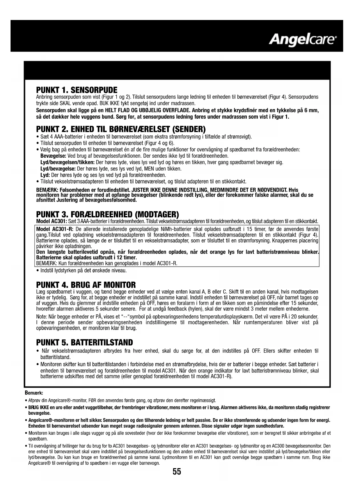 leaning products or solvents. Wipe Sensor Pad with a very slightly damp cloth with an antiseptic or mild detergent. OBJECT AND LIQUID ENTRY: Care should be taken so that objects do not fall onto units and that liquids are not spilled into either unit or Sensor Pad through its openings. NON-USE PERIODS: When not using monitor for long periods, remove the batteries from both units and disconnect the AC adapters from electrical outlet. Afprøvning af din Angelcare®-monitor Bemærk: Afprøv din Angelcare®-monitor, FØR den anvendes første gang, og afprøv den derefter regelmæssigt. Angelcare®-monitoren kan bruges andre steder end i vuggen, f.eks. på et andet sovested. Afprøv monitoren, når sensorpuden flyttes til et nyt sted, for at sikre, at følsomheden er indstillet korrekt i forhold til det nye underlag eller madrassen. Se afsnittet Justering af bevægelsesfølsomhed. Punkt 1. Indstil enheden til børneværelset til funktionen "Sound Only" (Kun lyd). Få en anden person til at tale ind i enheden til børneværelset, eller anbring en radio tæt på enheden til børneværelset. Du skal kunne høre lyd på forældreenheden. Hvis der ikke høres lyd, skal du se afsnittet Fejlfinding. Sørg for, at begge enheder er indstillet på samme kanal, dvs. enten A, B eller C. Skift til en anden kanal, hvis modtagelsen ikke er tydelig. Punkt 2. Afprøv monitoren for at registrere bevægelser. Indstil enheden til børneværelset på funktionen "Movement" (Bevægelse). Bevæg forsigtigt din hånd på madrassen. Det grønne lys vil fortsat blinke ved hver af dine bevægelser. Flyt hånden fra madrassen. Hvis der ikke sker nogen bevægelse, vil der høres en foralarm i form af en tikken efter 15 sekunder. 5 sekunder efter aktiveres alarmen, og det røde lys blinker konstant. BEMÆRK: Hvis alarmen ikke aktiveres, kan det skyldes, at sensorpuden har opfanget konstante vibrationer fra gulvet, at det trækker meget, eller at vuggen berøres. Undgå kontakt med vuggen, når monitoren er i brug. Anbring vuggen tæt på en bærende væg og på steder uden kraftige luftstrømme. Sensorpudens følsomhed skal muligvis reduceres, se afsnittet Justering af bevægelsesfølsomhed. Punkt 3. For at standse alarmen, skal du lægge hånden let på madrassen, for at sensorpuden igen kan registrere bevægelser. Det røde alarmindikatorlys på enheden til børneværelset vil fortsat blinke i 1 minut (Figur 3). Punkt 4. Bekræft, at batteritilstanden fungerer, ved at aktivere begge enheder uden vekselstrømsadapterne. Det grønne lys for strømforsyning skal lyse på begge enheder. Forældreenhed: Når det orange indikatorlys for lavt batteristrømniveau lyser, skal batterierne udskiftes med det samme på model AC301. Til model AC301-R genoplades forældreenheden i 12 timer. Enhed til børneværelset: Når det orange indikatorlys for lavt batteristrømniveau lyser, der høres en hurtig "klikken", temperaturindikatoren slukker, og enheden bipper hvert halve minut, skal batterierne udskiftes med det samme. Hvis dette ikke sker, bliver lyset rødt, og monitoren vil ikke længere fungere. Betjeningstips Justering af bevægelsesfølsomhed Drejeknappen til justering af bevægels- esfølsomheden er forudindstillet, så den passer til de fleste situa tioner