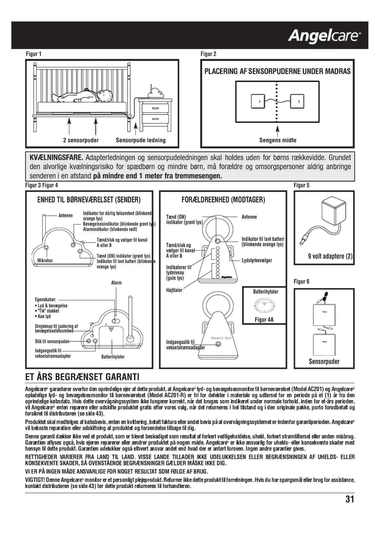 KVÆLNINGSFARE. Adapterledningen og sensorpudeledningen skal holdes uden for børns rækkevidde. Grundet den alvorlige kvælningsrisiko for spædbørn og mindre børn, må forældre og omsorgspersoner aldrig anbringe senderen i en afstand på mindre end 1 meter fra tremmesengen.32 5 NEMME PUNKTER TIL BETJENING AF DIN ANGELCARE