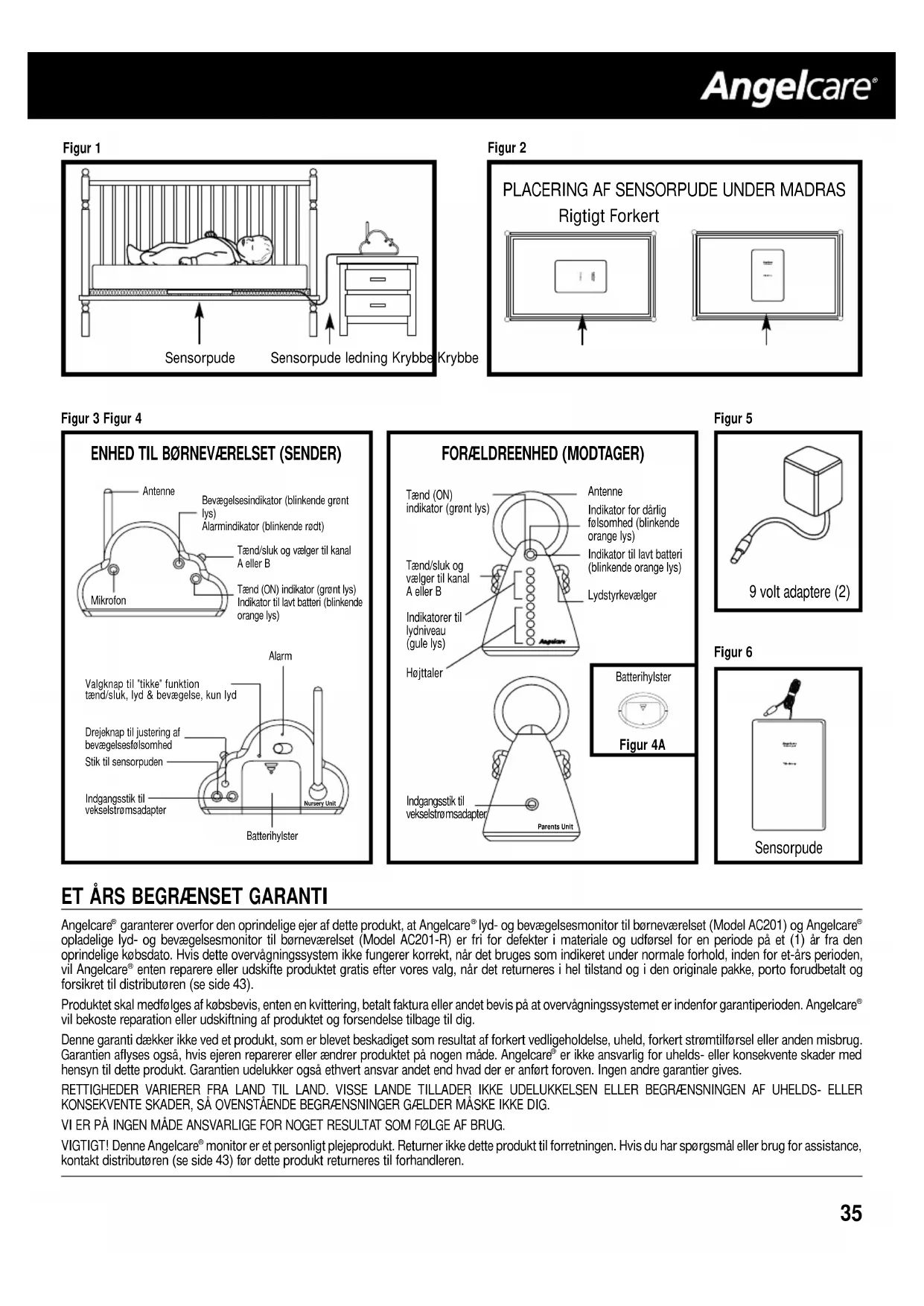 Parents UnitNursery Unit Indgangsstik tilvekselstrømsadapterDrejeknap til justering afbevægelsesfølsomhedBatterihylsterBatterihylster 9 volt adaptere (2) Antenne Bevægelsesindikator (blinkende grønt lys) Alarmindikator (blinkende rødt)MikrofonLydstyrkevælgerIndikator til lavt batteri(blinkende orange lys) Tænd/sluk og vælger til kanal A eller B Tænd (ON) indikator (grønt lys) Indikator til lavt batteri (blinkendeorange lys)Tænd (ON)indikator (grønt lys)Tænd/sluk ogvælger til kanalA eller BIndikatorer tillydniveau (gule lys)Højttaler Sensorpude Figur 6 AlarmValgknap til "tikke" funktion tænd/sluk, lyd & bevægelse, kun lyd Indgangsstik tilvekselstrømsadapterStik til sensorpudenIndikator for dårligfølsomhed (blinkendeorange lys) Sensorpude ledning Krybbe Krybbe Sensorpude Figur 3 Figur 4 Figur 4A Figur 5 ENHED TIL BØRNEVÆRELSET (SENDER) FORÆLDREENHED (MODTAGER) Antenne