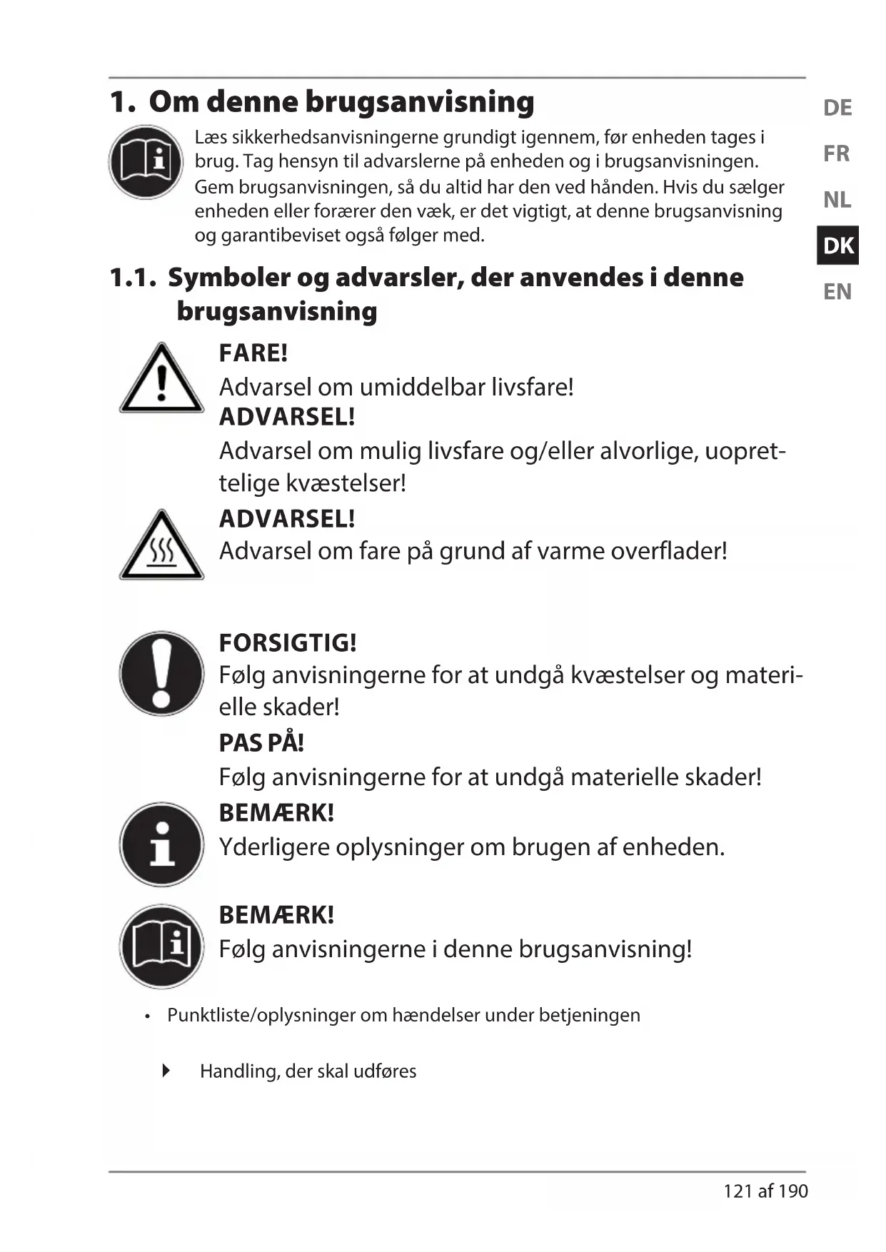 Læs sikkerhedsanvisningerne grundigt igennem, før enheden tages i brug. Tag hensyn til advarslerne på enheden og i brugsanvisningen. Gem brugsanvisningen, så du altid har den ved hånden. Hvis du sælger enheden eller forærer den væk, er det vigtigt, at denne brugsanvisning og garantibeviset også følger med. 1.1. Symboler og advarsler, der anvendes i denne brugsanvisning FARE! Advarsel om umiddelbar livsfare! ADVARSEL! Advarsel om mulig livsfare og/eller alvorlige, uopret- telige kvæstelser! ADVARSEL! Advarsel om fare på grund af varme overflader! FORSIGTIG! Følg anvisningerne for at undgå kvæstelser og materi- elle skader! PAS PÅ! Følg anvisningerne for at undgå materielle skader! BEMÆRK! Yderligere oplysninger om brugen af enheden. BEMÆRK! Følg anvisningerne i denne brugsanvisning!