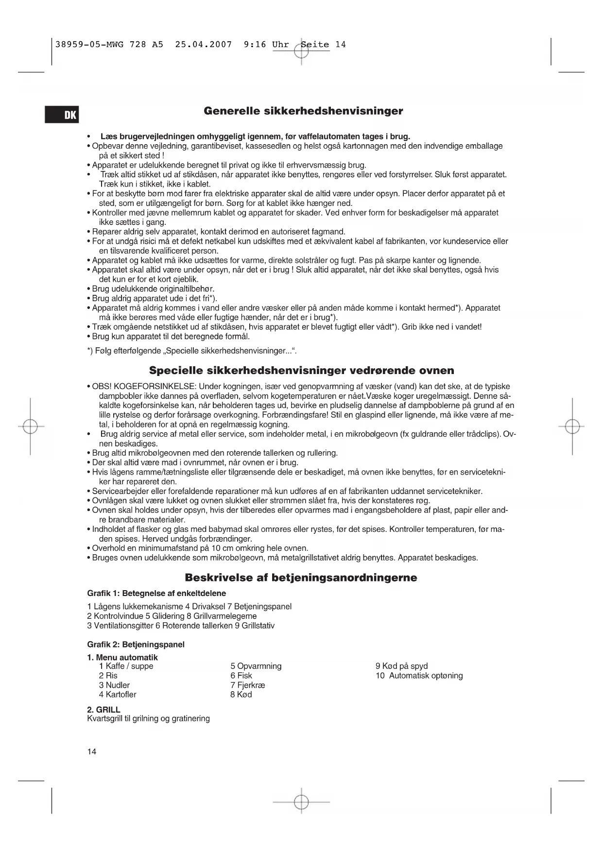 - Læs brugervejledningen omhyggeligt igennem, før vaffelautomaten tages i brug.