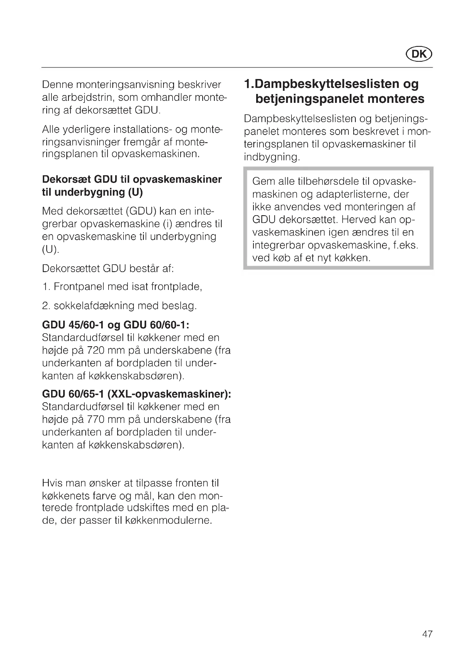 GDU 45/60-1 og GDU 60/60-1: Standardudførsel til køkkener med en højde på 720 mm på underskabene (fra underkanten af bordpladen til under- kanten af køkkenskabsdøren). GDU 60/65-1 (XXL-opvaskemaskiner): Standardudførsel til køkkener med en højde på 770 mm på underskabene (fra underkanten af bordpladen til under